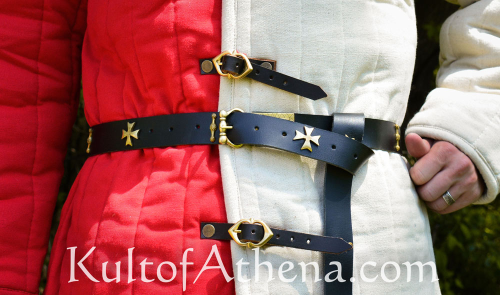 This Crusader Belt is crafted from thick, high quality 7 – 8 oz black leather and is thoroughly embellished in brass crosses and bar studs. The gothic style buckle and chape complete this Crusaders belt.