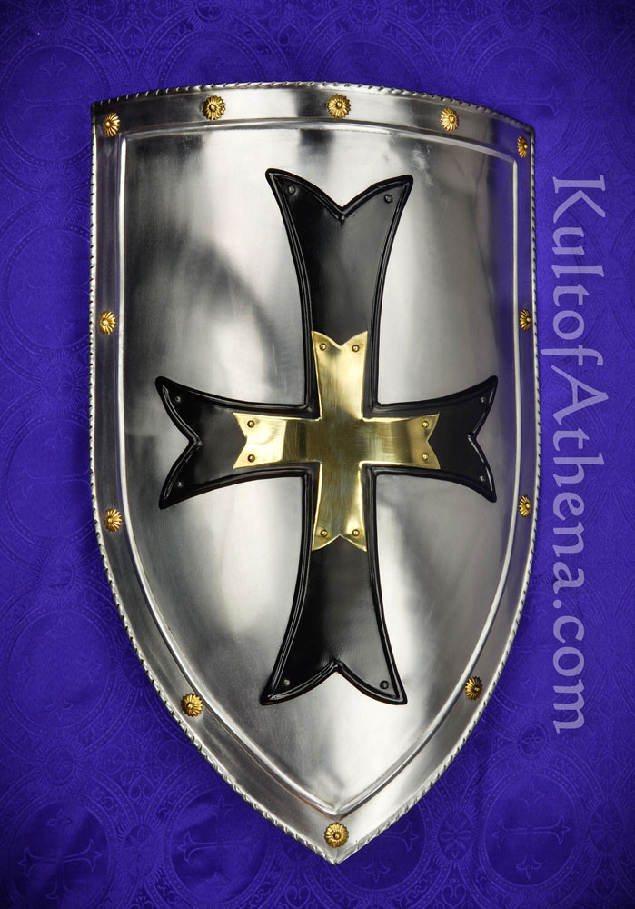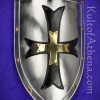 This Crusader Shield is crafted from 18 gauge steel and is emblazoned with a large central cross of blackened steel and brass. It is framed in brass sunburst medallions and finished with slashed edging.
