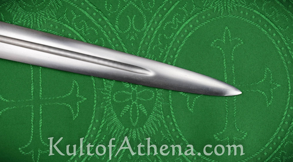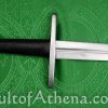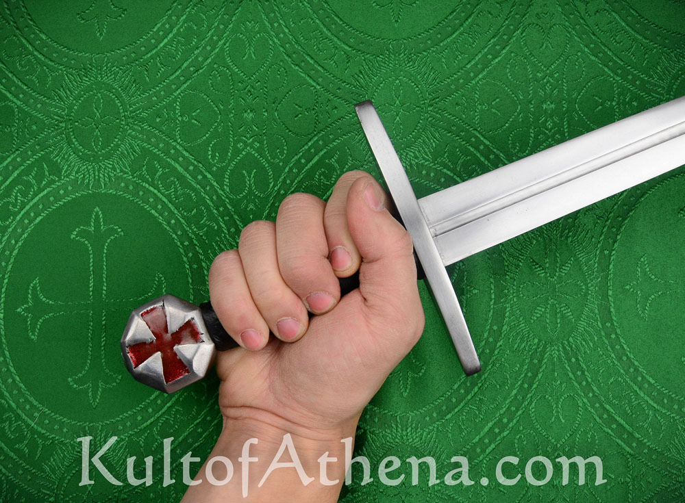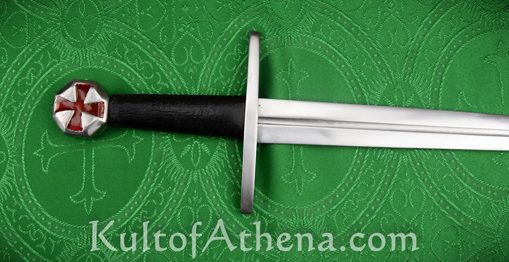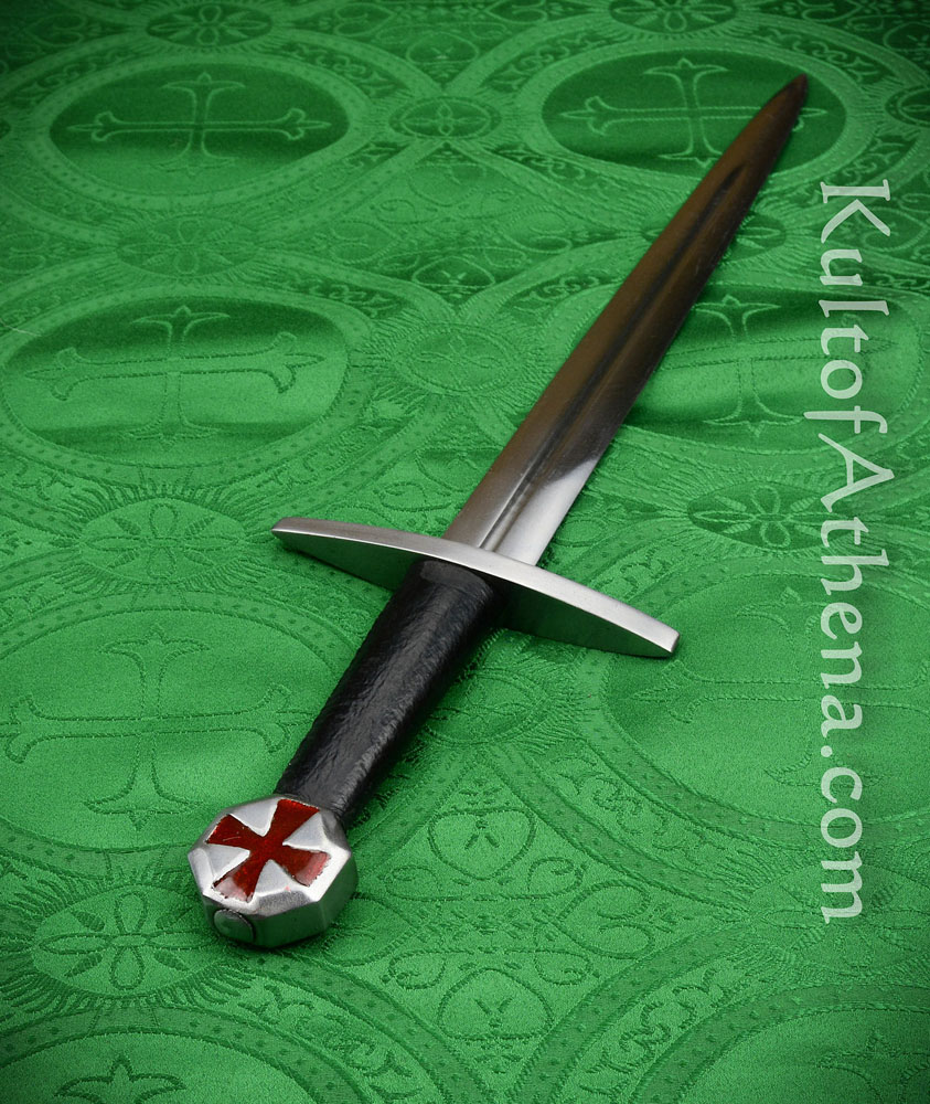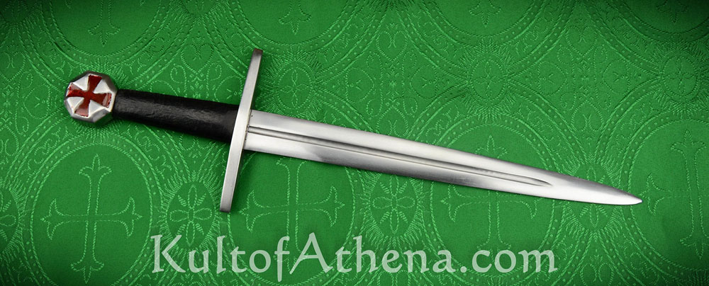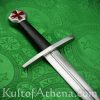 This Crusading Knight dagger has is a large dagger with a blade crafted from EN45 high carbon steel. The crossguard and pommel are of steel and the wooden grip is overlaid in tightly-stitched leather which was shrunk and treated in the traditional manner with beeswax. Inlaid, vibrant enamelling of the pommel cross completes the dagger.