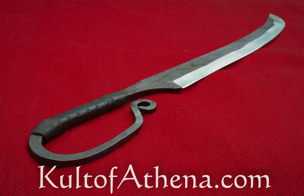 A common tool and weapon for the lower classes of 16th and early 17th century Central Europe, this wholly utilitarian form of the Dussack cutting sword is hand forged from a single billet of steel and has its tang cunningly formed into a single piece grip and knuckle bar. The steel is 1035 high carbon steel which was tempered to a final 50-54 HRc hardness. Like originals it was left with a rough state of polishing which leaves the marks from the blows of the hammer visible. It has a simple wrap of leather around the grip and it comes with a stitched sheath of faux leather. The sheath has a buttoned retaining strap and a belt loop for easy wear.
