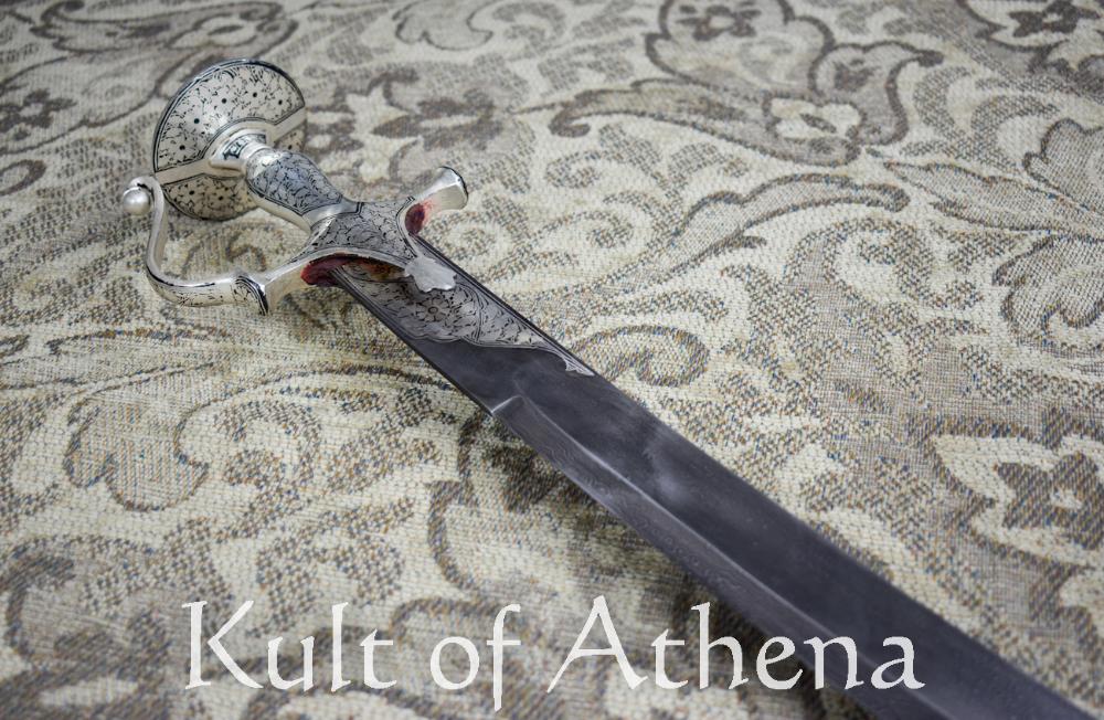 The patterning of the damascus blade varies with each blade in much the same manner as all fingerprints differ. Also the Koftgari designs are made to the individual design and artistry of the smith. Therefore every one of the swords of this type are uniquely crafted and are a testament to the traditional swordsmithing techniques of India.