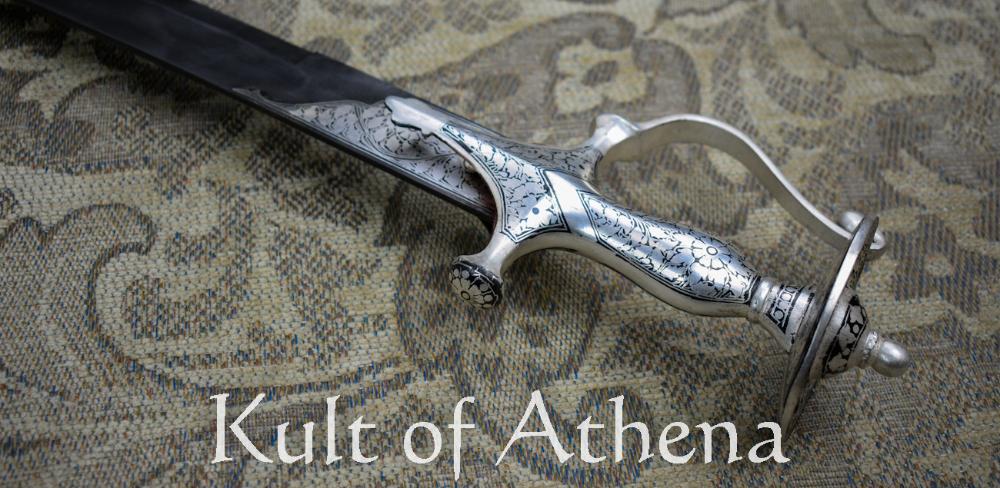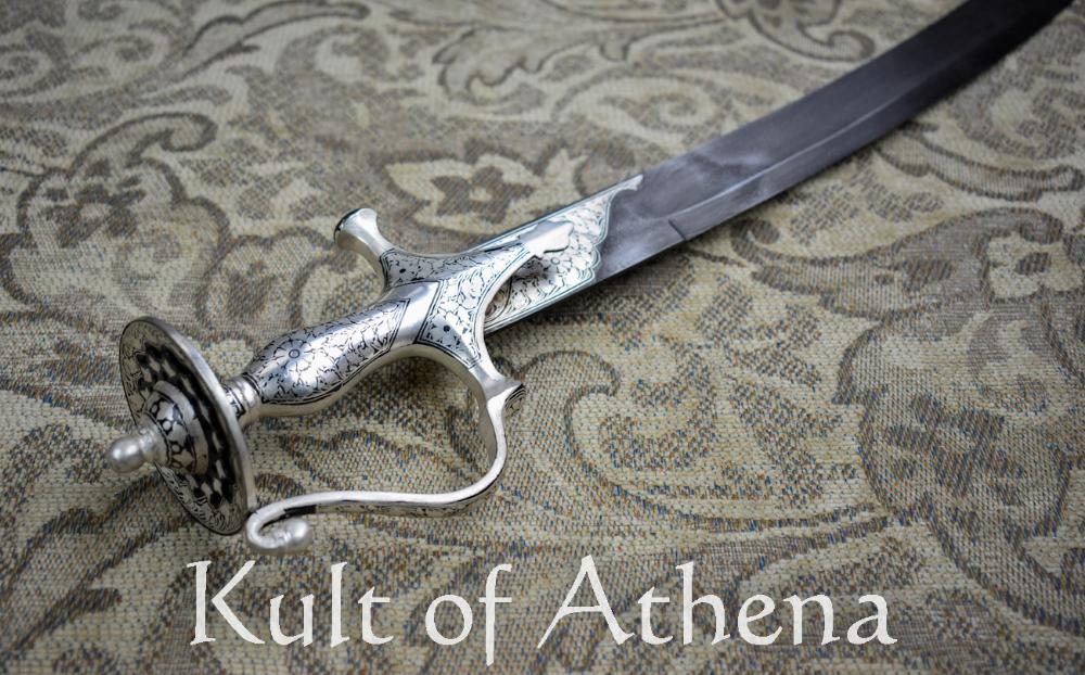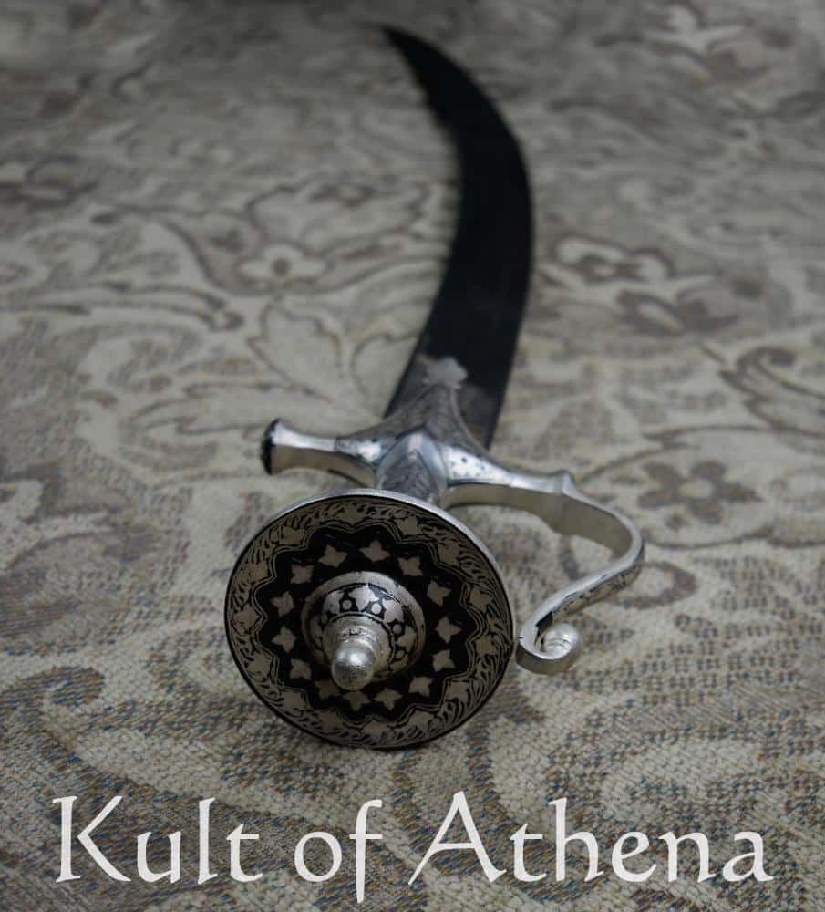 This was done to get good results from the quality of iron available for smithing. Damascus is now technically inferior to pure steel made from modern industrial-scale methods, but it is still desired as the beauty of Damascus is instantly notable and is a testament to the skill of the smith who forged it with the traditional methods and the blade was further embellished with silver inlay at the base of the blade. The elegant and intricate design and patterning on the hilt was created with the laborious Koftgari technique; a traditional process exemplified by Indian smiths whereby a design is etched and chiseled and then strands of silver wire is carefully hammered into the etched design. The hilt is then heated in a kiln and the silver wire is then permanently annealed into a permanent design.