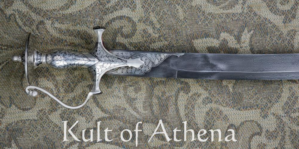 The sword is paired with a wood-core scabbard overlaid in vibrant velvet. Its steel components were decorated with silver koftgari to match the sword. The Damascus steel blade is crafted from the melding of two different steels into a single billet from which the smith forges the blade; the mixed steel leaves a vibrantly visible rippled patterning on the blade surface. Traditionally this was a technique done to merge harder and softer steels into a single blade to impart it with both a hardness for durability and edge retention and a degree of flexibility to prevent the blade from becoming brittle.