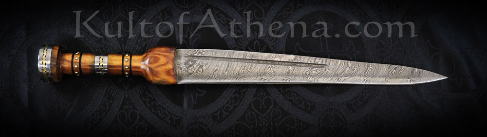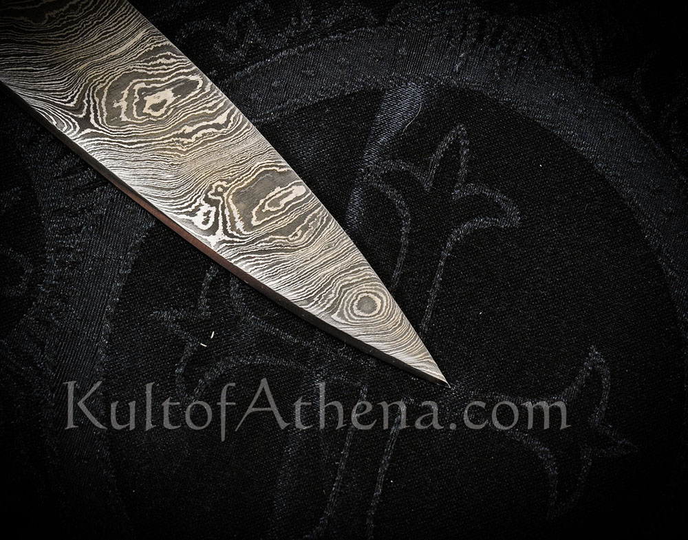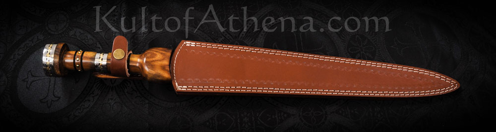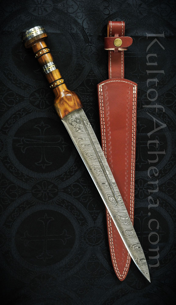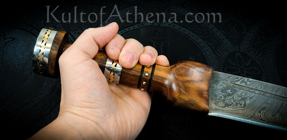 This long-bladed dirk has a blade of single-edged blade of damascus. The hilt is of polished hardwood with integrated layers of steel and brass in the center of the grip. Brass pins finish the grip and the pommel is capped with rondels of steel and file-work brass. The thick spine strengthens the blade and stiffens the spine; ideal for delivering a strong and puncturing thrusting strike.