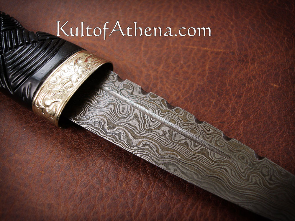 This Sgian Dubh has a blade of Damascus Steel – a melding of two different types of steels intended to impart the properties of harder and softer steel together in a single blade. The black grip is of wood – carved with a thistle design on a single side and smooth on the other – it is surmounted by fittings of nickel silver. It comes with a wooden sheath covered in black leather with steel fittings.