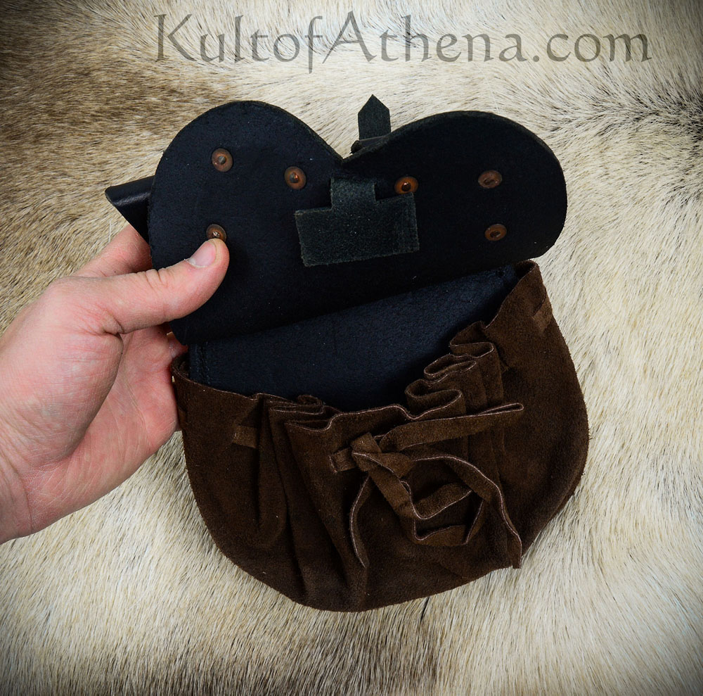 This Dark Ages / Medieval belt pouch is crafted from quality leather and finely stitched construction. The pouch is a backing of stout leather and is coupled with a suede leather pouch with an integrated leather cord with which to adjust its size and cinch it tightly. The pouch is secured with its front flap with an adjustable brass buckle and leather strap. Brass accoutrements are riveted into the front flap. Belt loops by which to hang this pouch are integrated onto the pouch.