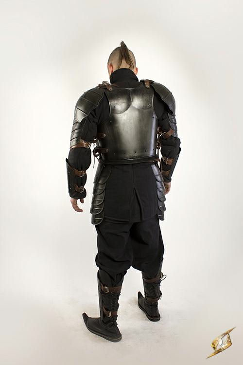 This Complete Dark Drake Armour set includes Epic Armourys Dark Drake, Breastplate, Shoulderplates, Upper Legs, Arm Protection, Leg Protection, and Dark Warrior Backplate in order to fully gear your costume needs at a lower cost. Each armour piece is made from galvanized 19 gauge mild steel with rolled edges and top-grain leather straps and fittings, and is treated with Epic Armourys Epic Dark Metal coat to give the armour a rugged, antique finish. Built to withstand the abuse of a LARP or reenactment while keeping the user safe and comfortable, regular leather and metal armour care will make this armour set last for a long time!