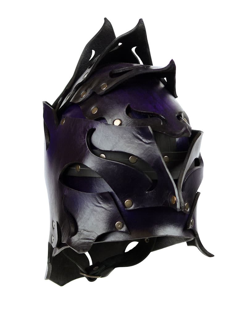 This sinister Dark Elf Helmet with its angular and segmented plates evokes a crippling sense of dread and foreboding; an ideal helmet for your dark elf shadow warrior, warlock or dark cultist character. It is quality-crafted in Canada from robust 8-9 oz vegetable tanned leather with brass rivets and brilliantly dyed in purple hues.