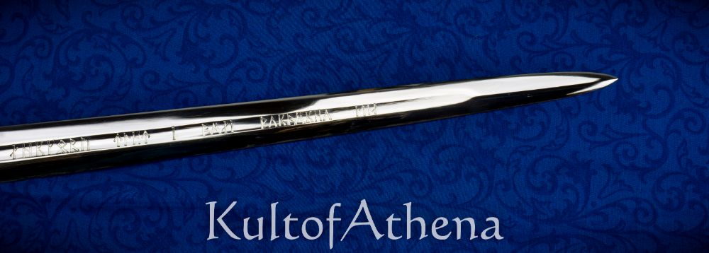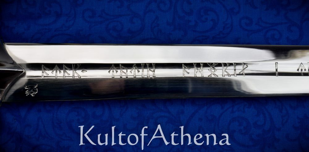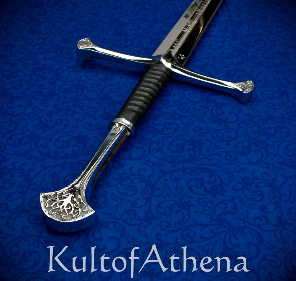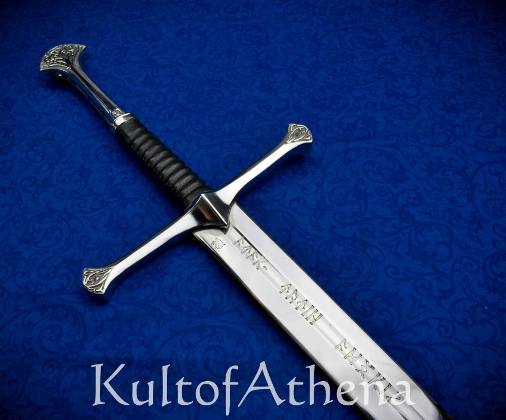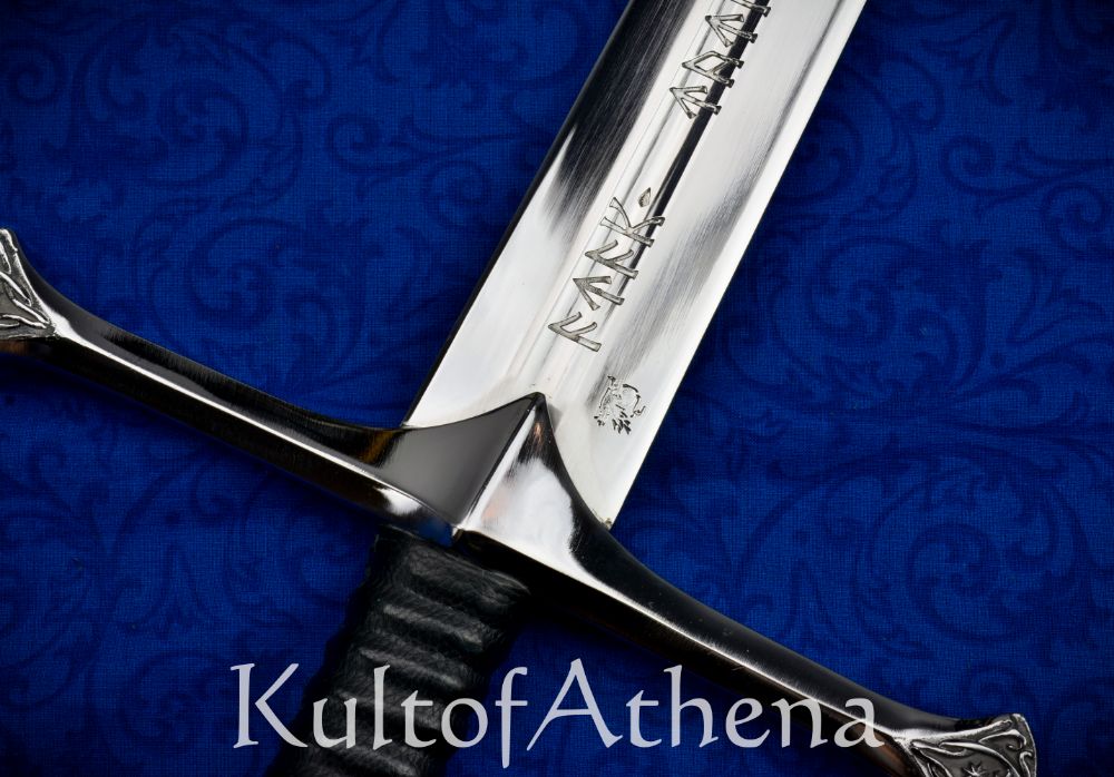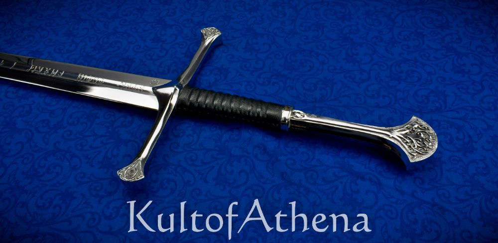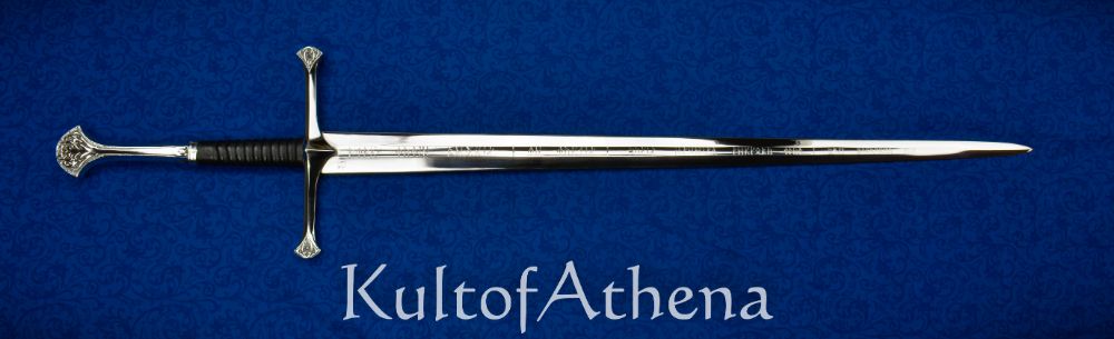 The Lord of the Rings Anduril sword is a recreation from the popular trilogy written by J.R,.R. Tolkien. The Anduril is hand Crafted with 5160 High Carbon steel, dual hardened to a Rockwell of 60 at the edge and 48-50 at the core. The beautifully detailed leather handle is accentuated by the unique pommel, making this one of the most recognized fantasy swords. The blade is forged with a deep full length fuller and is etched on both sides with runic inscription. The guard and pommel are crafted from steel and the sword is matched with a wood-core scabbard which is tightly bound in leather and completed with a protective steel chape and an integrated sword belt.
