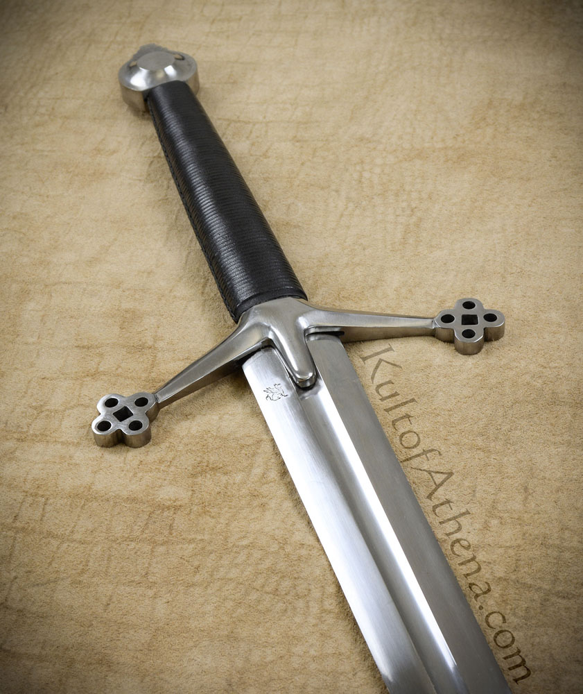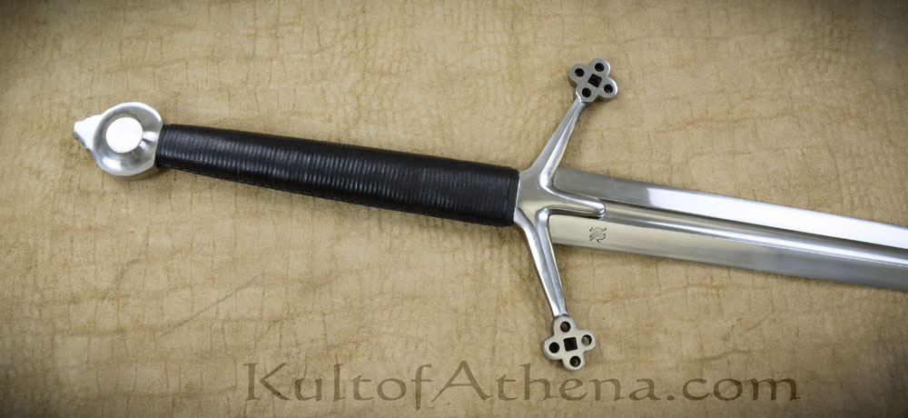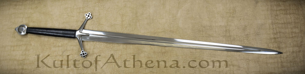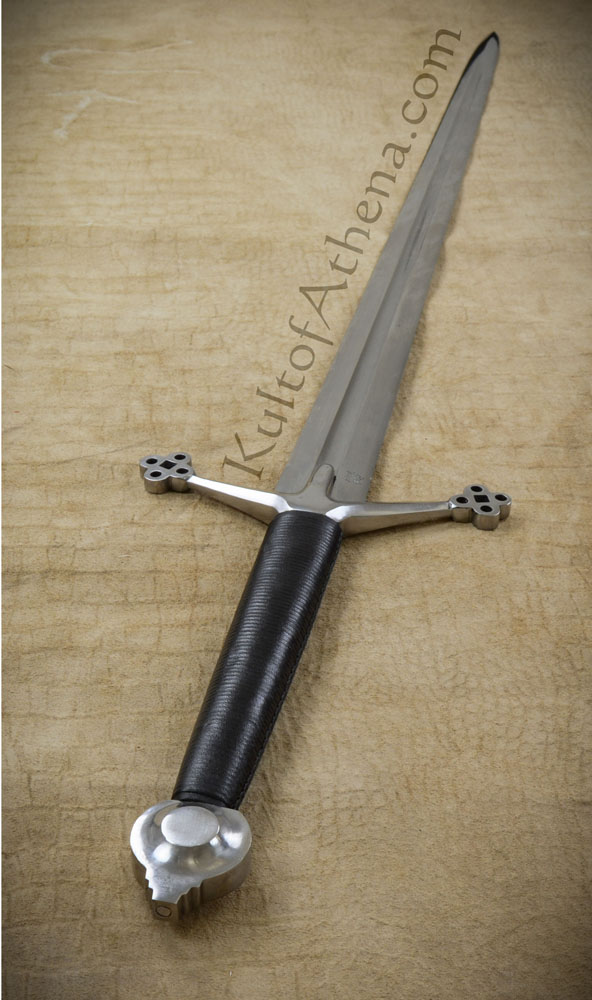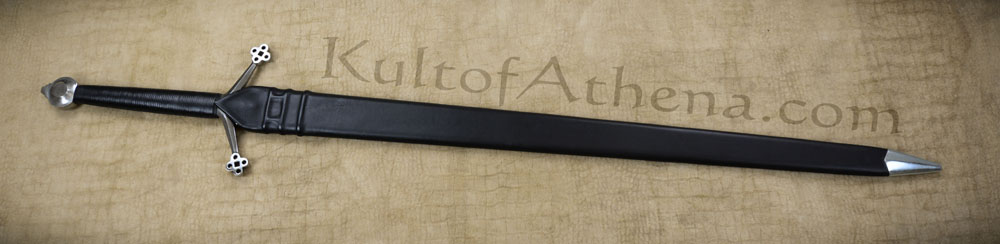 The Darksword Armory Scottish Claymore features a thick, tempered, high carbon steel blade with central fuller. The guard and pommel are steel while the grip is wood covered in black leather. Includes a wood scabbard with black leather wrap and steel tip.