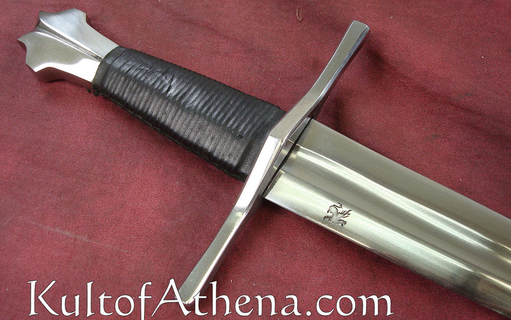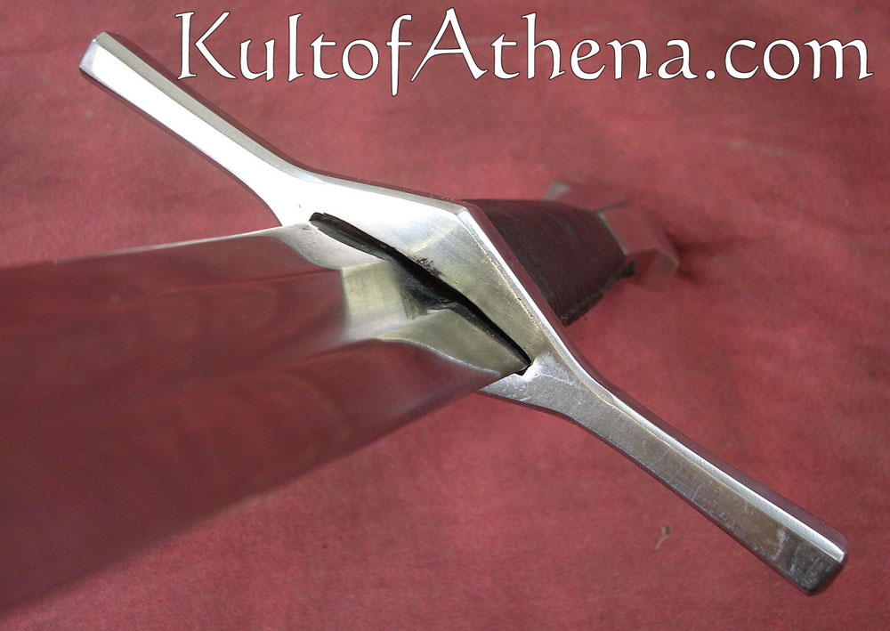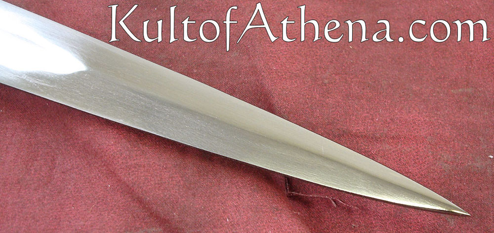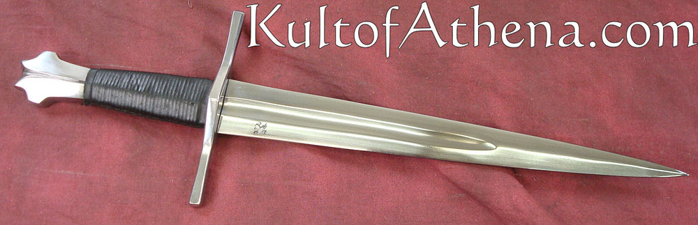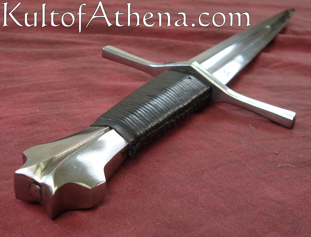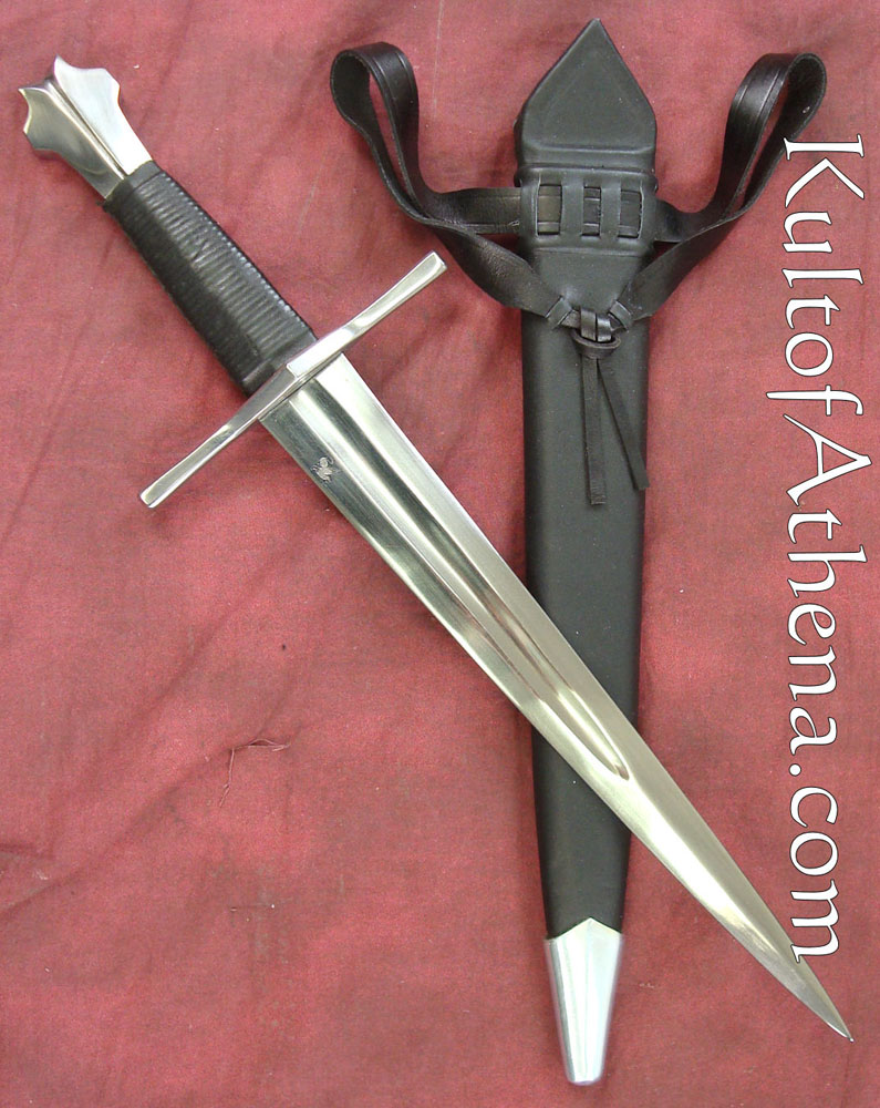 This Darksword Armory dagger is clearly the dagger of a medieval warrior. Purpose built solely for war, it has a tapered blade profile so that it can slip between and through the weak points in armor. The crossguard gives good protection to the hand. The blade is crafted from unsharpened, 1060 high carbon steel. The guard and pommel are of steel and the grip is wood overlaid with black leather. Comes with a wood-core scabbard that has been tightly overlaid with black leather. It has an integrated, interwoven belt frog.