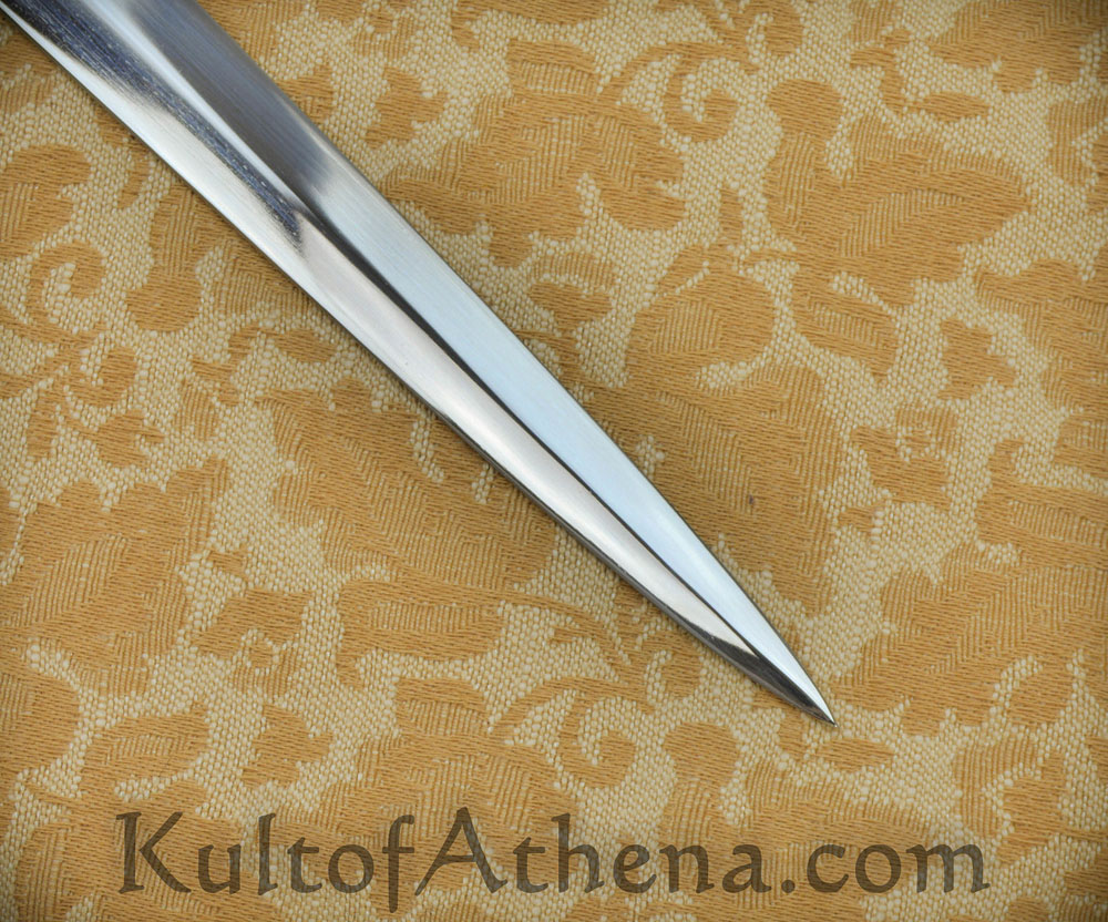 The Darksword Armory Knights Gothic Sword features a high carbon steel blade with central fuller. The guard and pommel are steel, while the grip is wood with brown leather wrap. Includes a wood scabbard with brown leather wrap, steel accents and an integrated belt.