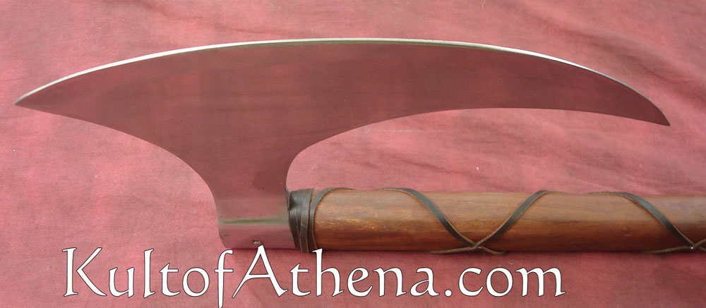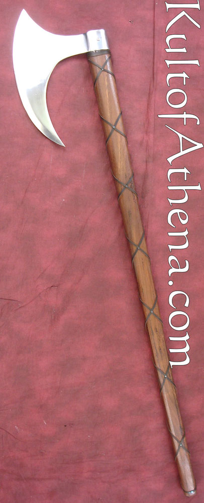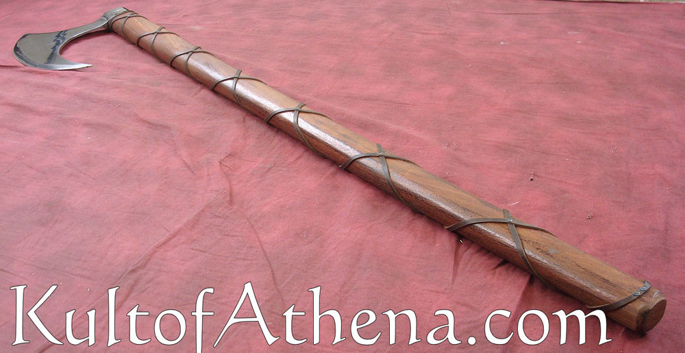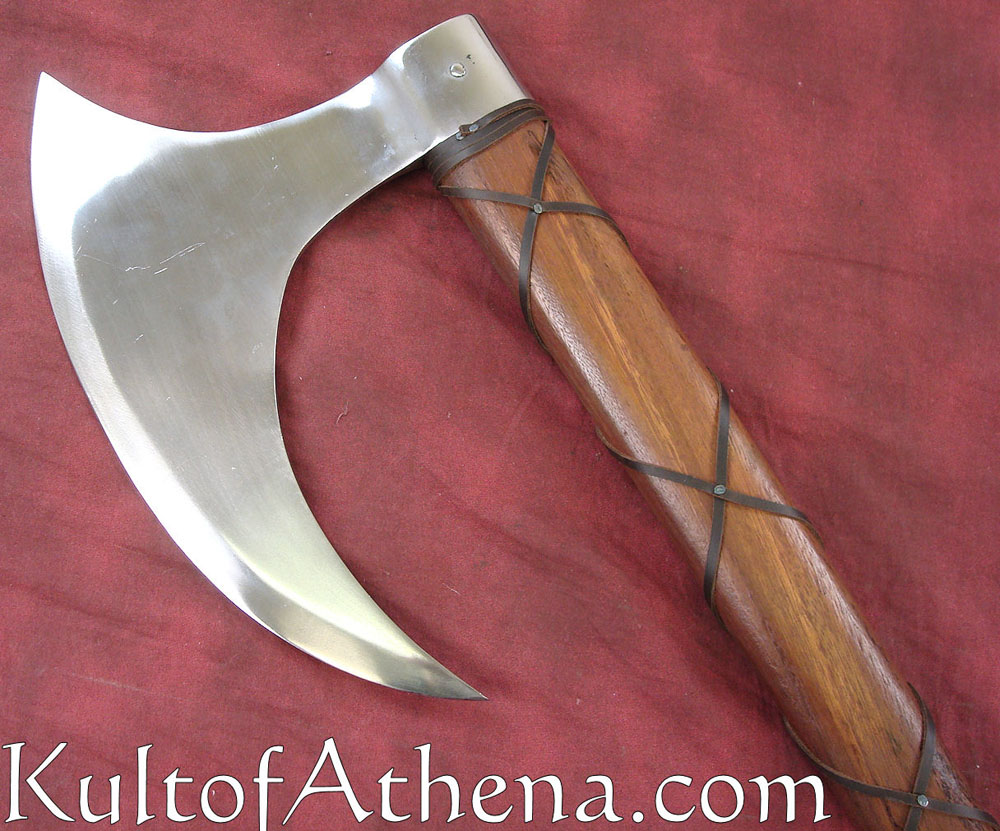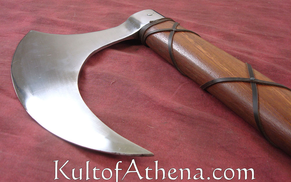 This two-handed Viking Axe is of a type most famously wielded by the Danes and their descendents. Professional warriors in Saxon England and even far flung Byzantium brought the Danish styled Axe down upon their foes. It has an axehead of unsharpened high carbon steel. The axe has been riveted to a haft of wood and leather grip lacing has been added, which is held in place with metal tacks.