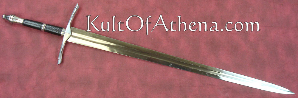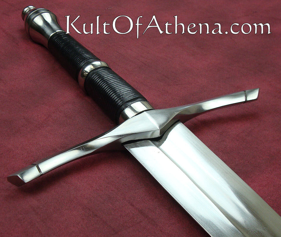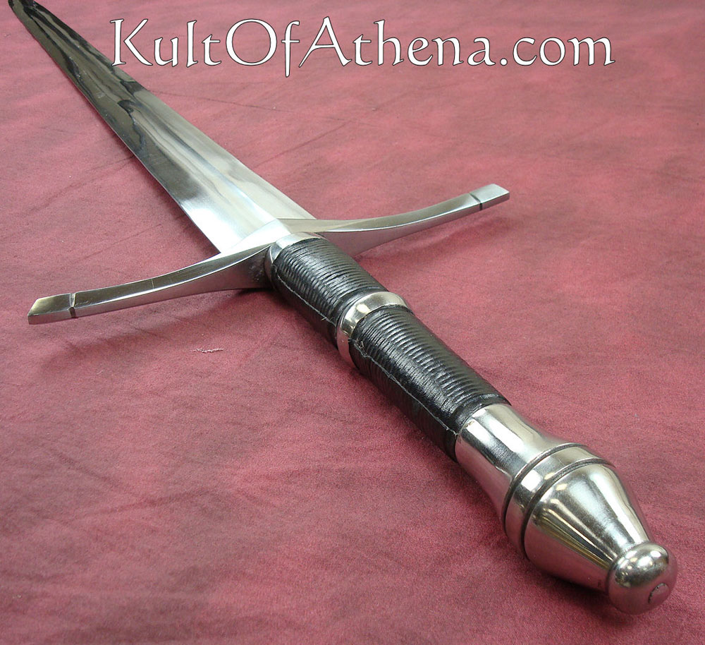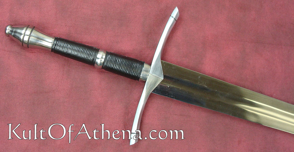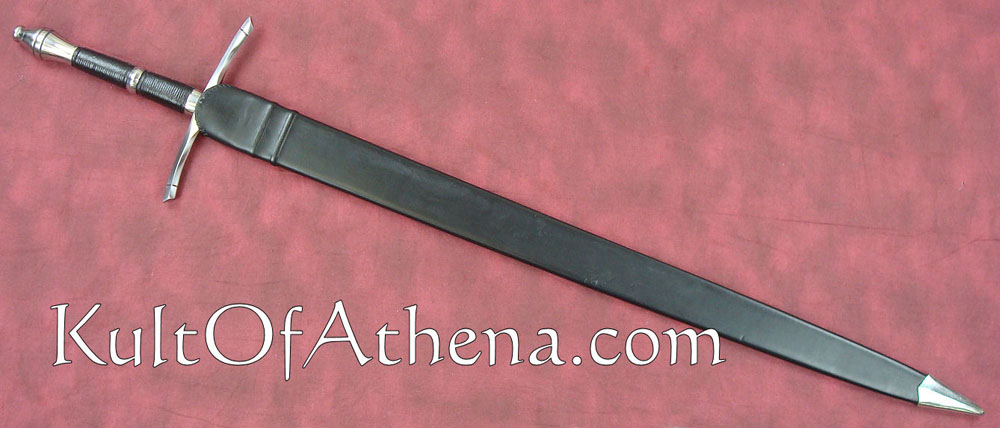The Darksword Armory Ranger Sword is hand crafted with a blade of 5160 High Carbon steel, tempered to a Rockwell of 53. The blade is forged with a deep full length fuller. The guard and pommel are made of steel., while the grip is wood with a black leather wrap and steel accent ring. Includes a wood scabbard with black leather wrap and steel accents.