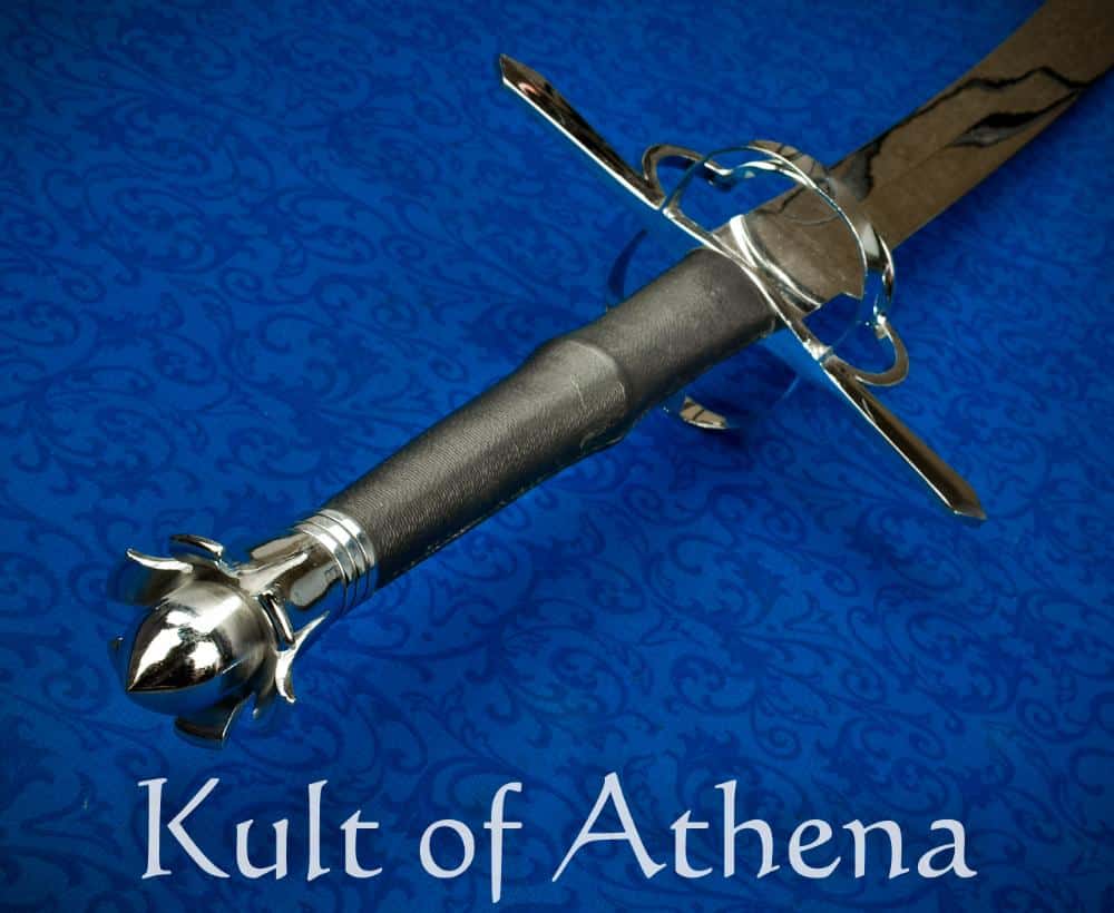 The blade is forged from resilient 5160 high carbon spring steel and tempered for a hard, edge-retaining edge while leaving the blade’s body softer and more flexible for shock absorption. Its hilt components — including the ring-guard and flared pommel — are crafted from steel for durability. The wooden grip is overlaid with tight black leather for secure handling. A wood-core scabbard wrapped in matching black leather and tipped with a steel chape completes the set.