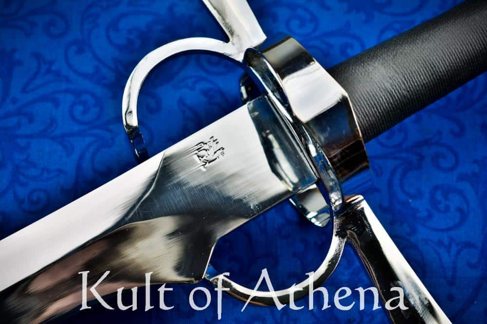 The Swiss Saber by Darksword Armory is a large and battle ready two-handed sword with an inspiration from late medieval Swiss designs. Forged from 5160 high carbon spring steel, the almost 34″ blade features a differentially hardened blade with a 60 HRC edge and a resilient 48–50 HRC core for both sharpness and durability. With its ring-hilt guard, long grip, and wide chopping blade, the Swiss Saber is a commanding weapon suited for collectors, reenactors, and practitioners who favor power and reach. With its long blade and extended grip, the Swiss Saber delivers powerful, cleaving strikes and excels in cutting practice or display. Its 4 pound weight gives it authority in the cut, but the elongated grip provides leverage to keep the weapon maneuverable.