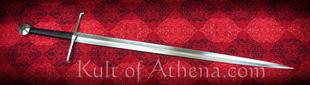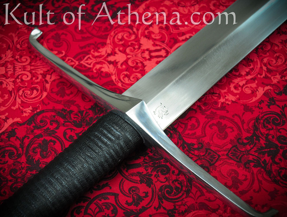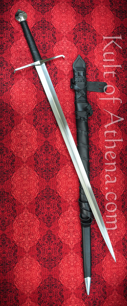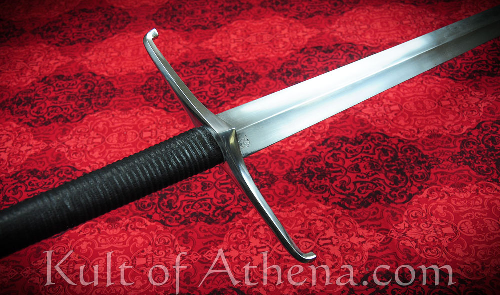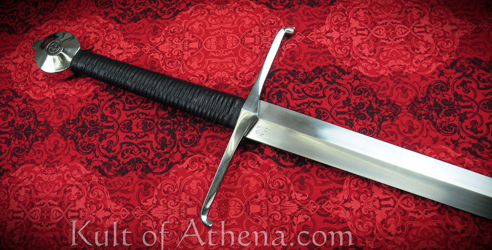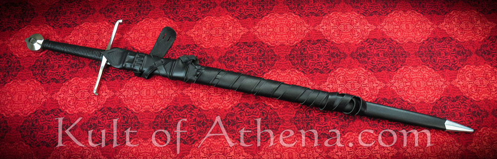 The crossguard and pommel are of steel and the grip is cord-wrapped wood overlaid with tightly-fitted black leather. The sword is accompanied by a scabbard with a core of wood and a form-fitted skin of black leather. It has a steel chape to protect the tip from damage. The scabbard is fitted with an integrated sword belt of black leather.