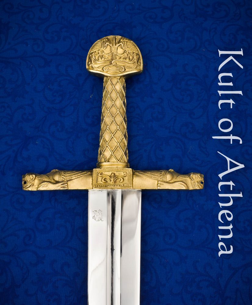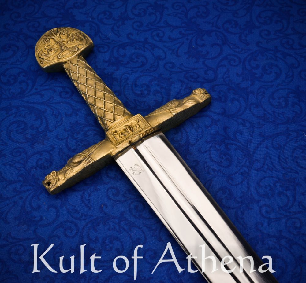 The Darksword Armory Charlemagne Sword is one of their most anticipated projects and has been in development since Darksword Armory founder Eyal Azarad’s visit to the Louvre. A broad, solid blade with a single fuller matches the antique on display, and is made from 5160 high carbon steel as are all our blades. The tang for this sword was made especially thick in order to provide additional stability. The hilt furniture, however, is where the quality of our work truly shines. The handle on the original, as well as its crossguard, and pommel were made from gold and many modern reproductions use brass or gold-plated metal; Darksword Armory uses the lost wax process to cast the hilt furniture of this reproduction out of bronze. The incredible detail on our version of Joyeuse is one of the only battle-ready versions of Charlemagne’s sword available today.