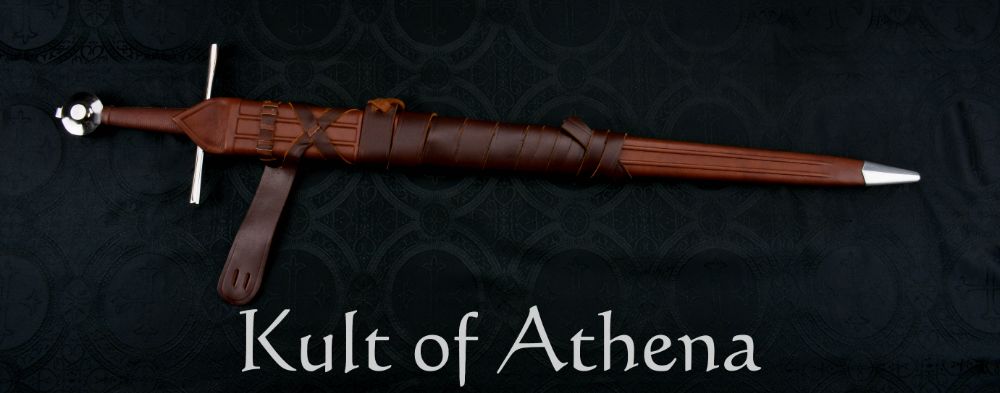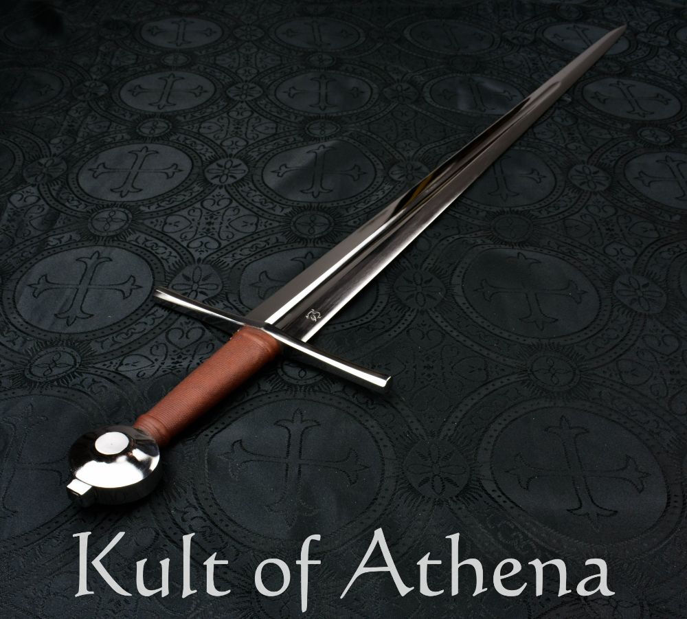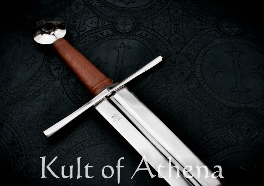 The Duke sword is inspired by an illustration in Eugène Emmanuel Viollet-le-Duc medieval encyclopedia, a masterwork of exposition and illustration. The blade of the Duke is forged from mirror-polished 5160 high carbon steel which is differentially tempered to possess a hardened edge of 60 HRc steel and a flexing, shock absorbing core of 48-50 HRc hardness. The guard and pommel are of steel and the wooden grip is bound in leather. The blade is securely anchored into the hilt with a robust peen on the pommel. Included with the sword is a wood-core scabbard which is tightly bound in leather and completed with an integrated sword belt and a protective steel chape.