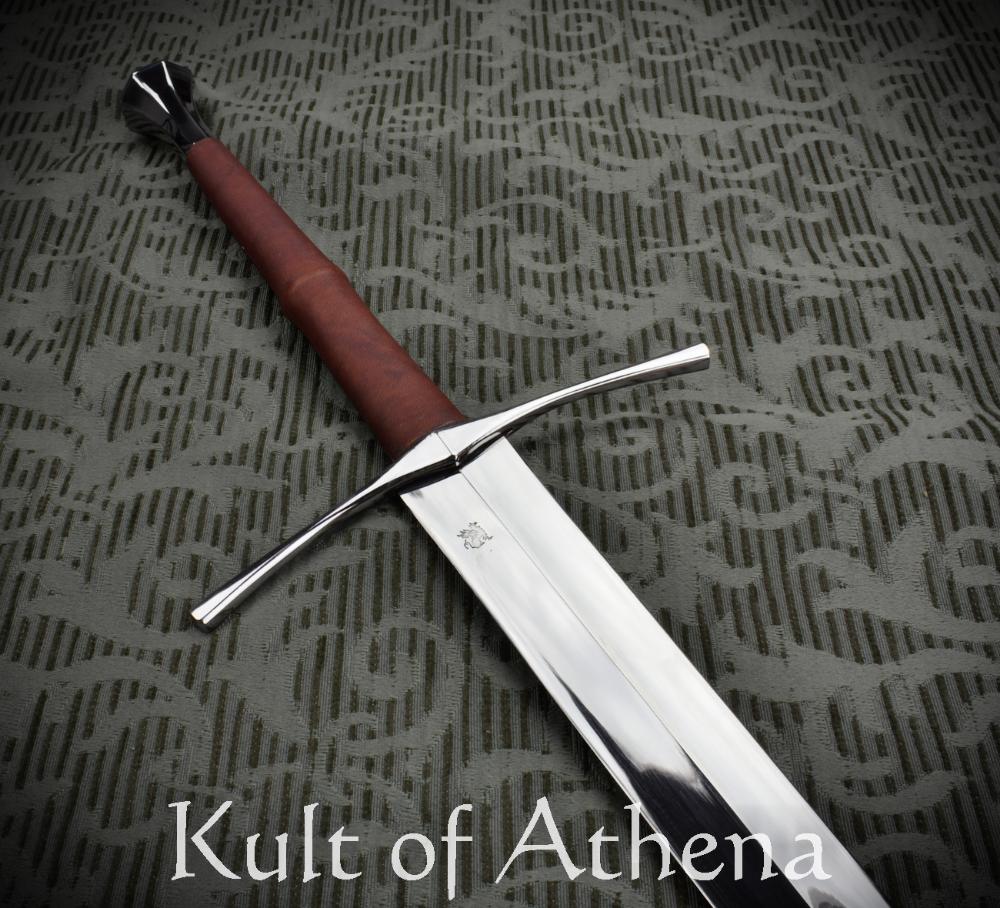 Inspired by the Italian greatswords of the 16th century, the Medici, type XVIIIb, Two-Handed Sword is a surprisingly elegant and nimble design. The long, slender blade of well tempered 5160 high carbon steel is rendered a strong thrusting weapon due to the diamond cross-section, allowing it to slip between plates of armor and split rings of mail. Yet the reasonable point-of-balance and extended, leather-wrapped handle create a weapon that flows smoothly through guard, cut, and thrust, not limiting it to a single style of offence. The gracefully curved steel guard and scent stopper pommel complement the simple and straightforward blade, and everything is polished to a mirror sheen. The Medici, named for the Italian political dynasty that were for a time the de facto rulers of Italy, is a beautiful weapon that deserves to be a centrepiece in your home.