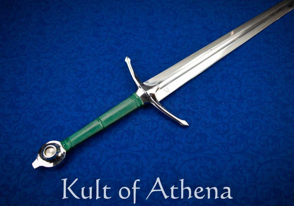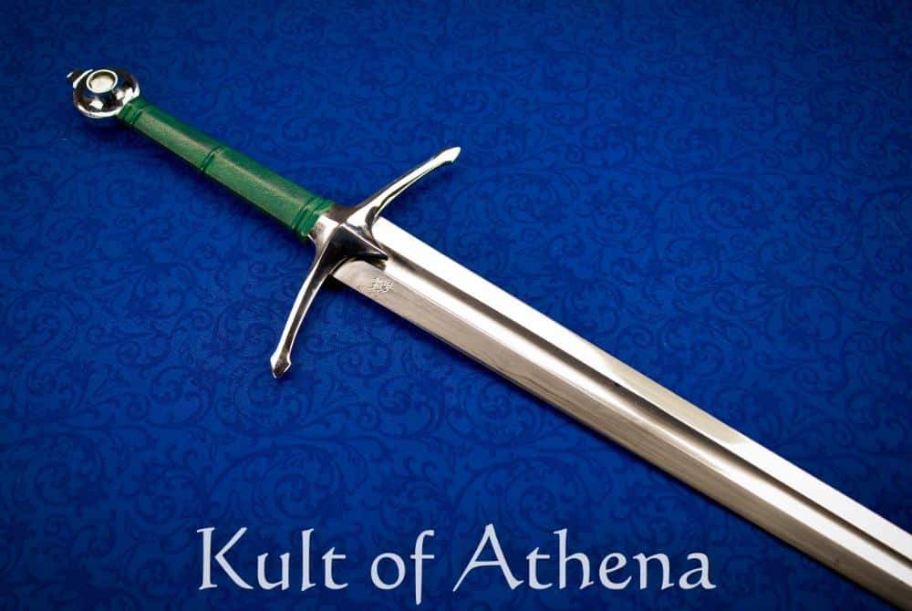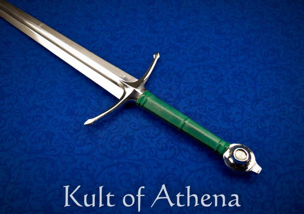 Scotland and Ireland were one of the rare parts of Medieval Europe that had sword designs that were culturally unique, separate and unrepresented on the continent. This longsword takes its elegant form from an arming sword shown on the grave effigy of Gilbert de Greenlaw, a Scottish Knight who fell at the 1411 Battle of Harlaw. Its upswept guard and “teardrop” wheel pommel are full of medieval Scottish character. Robustly constructed, the battle-ready sword is great for collectors, reenactors and test-cutting enthusiasts alike. Designed during a turbulent period marked by clan warfare and regional conflict, this sword emphasizes durability, cutting authority, and straightforward functionality.