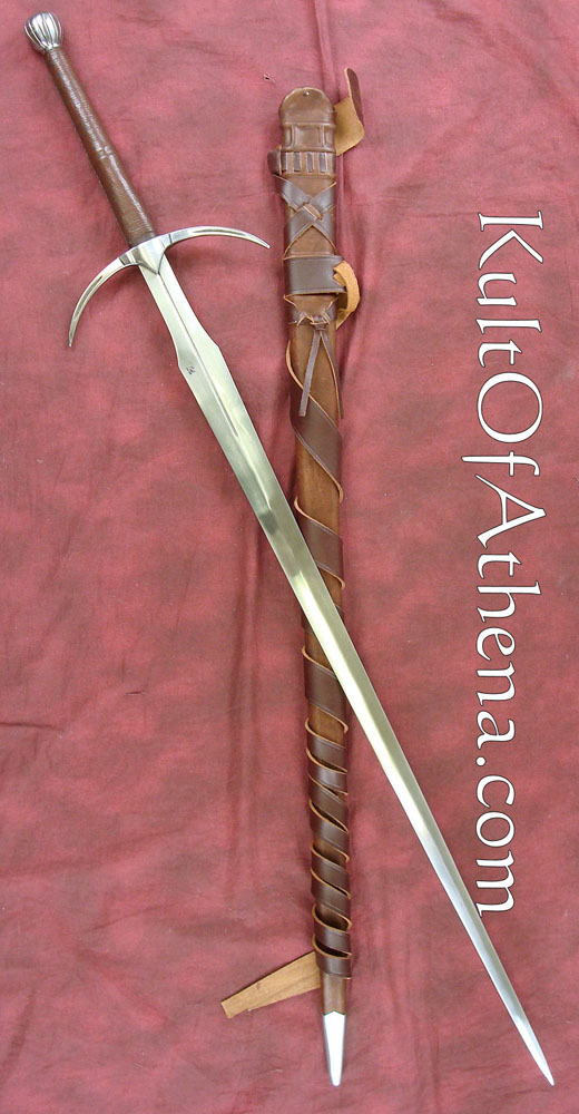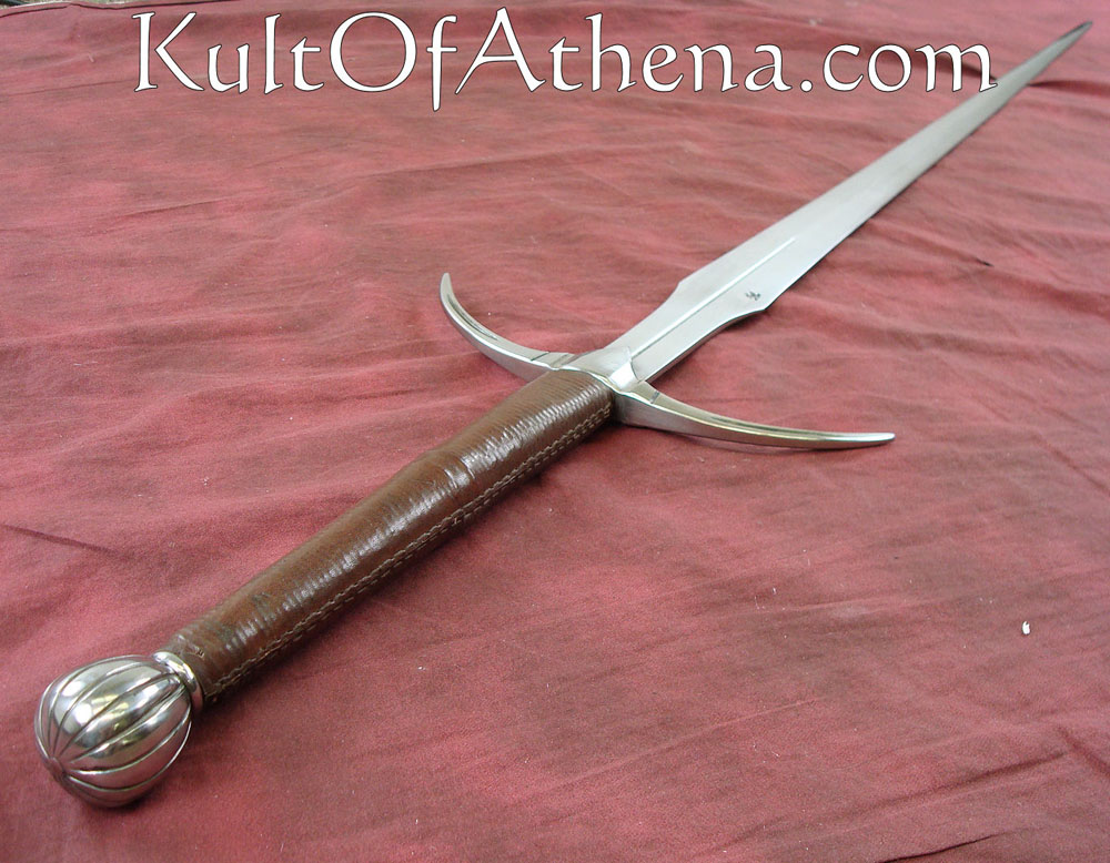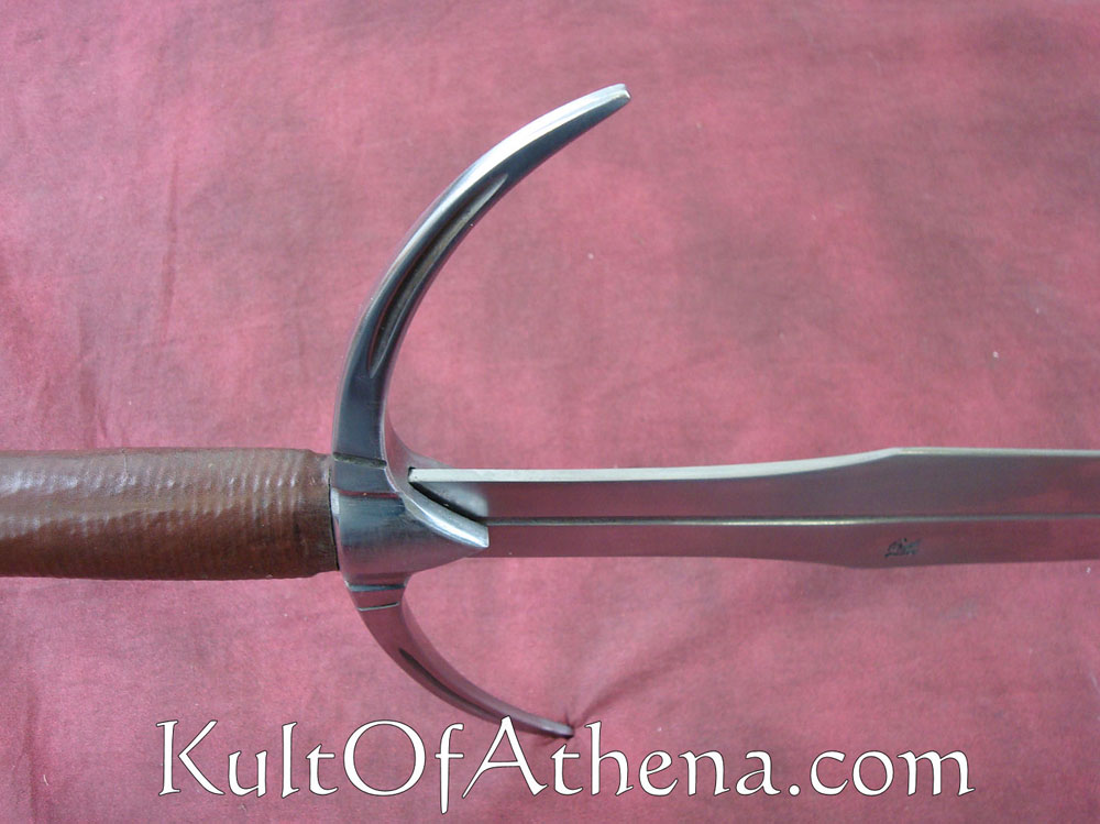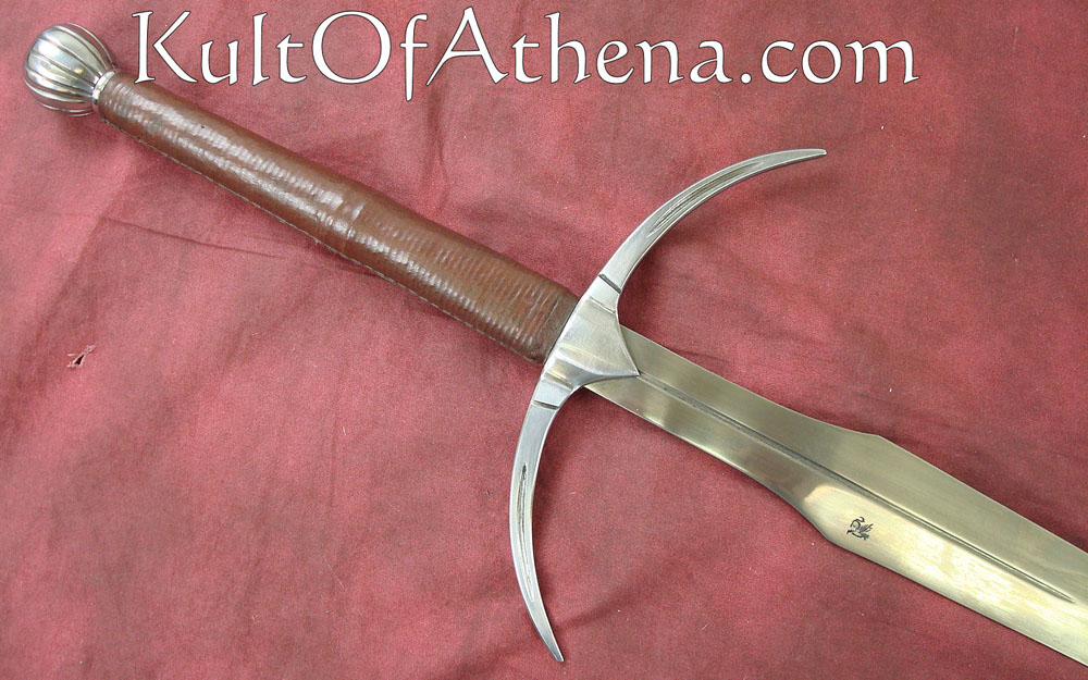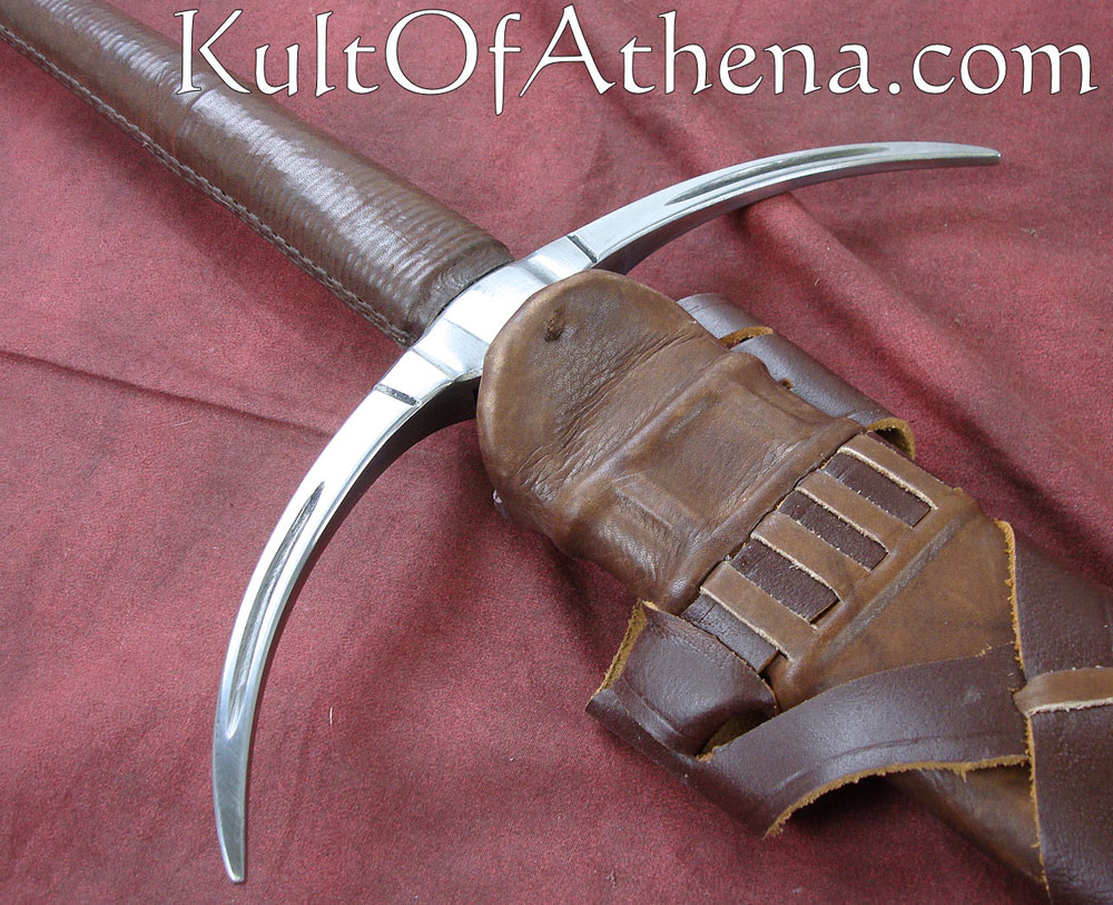 Danish Two Handed Sword I didn’t buy this blade from Kult of Athena, but from DSA directly (big mistake for my wallet, and the 3 month wait didn’t help either), but when I got it I was very impressed. I did the unboxing outside so the first time I saw it would be in full glory of the sun. The fittings are very secure, the leather grip is even, with solid stitching. I did order it sharp and as far as I’m concerned it’s sharp enough; sharp enough to cut but not so sharp it chips. What impressed me for the price though is the scabbard and belt. It’s very sleek, and the belt is thick and durable. The sword doesn’t fit very tightly in the scabbard, but I prefer little resistance when drawing the sword, so to me it’s a positive thing.
