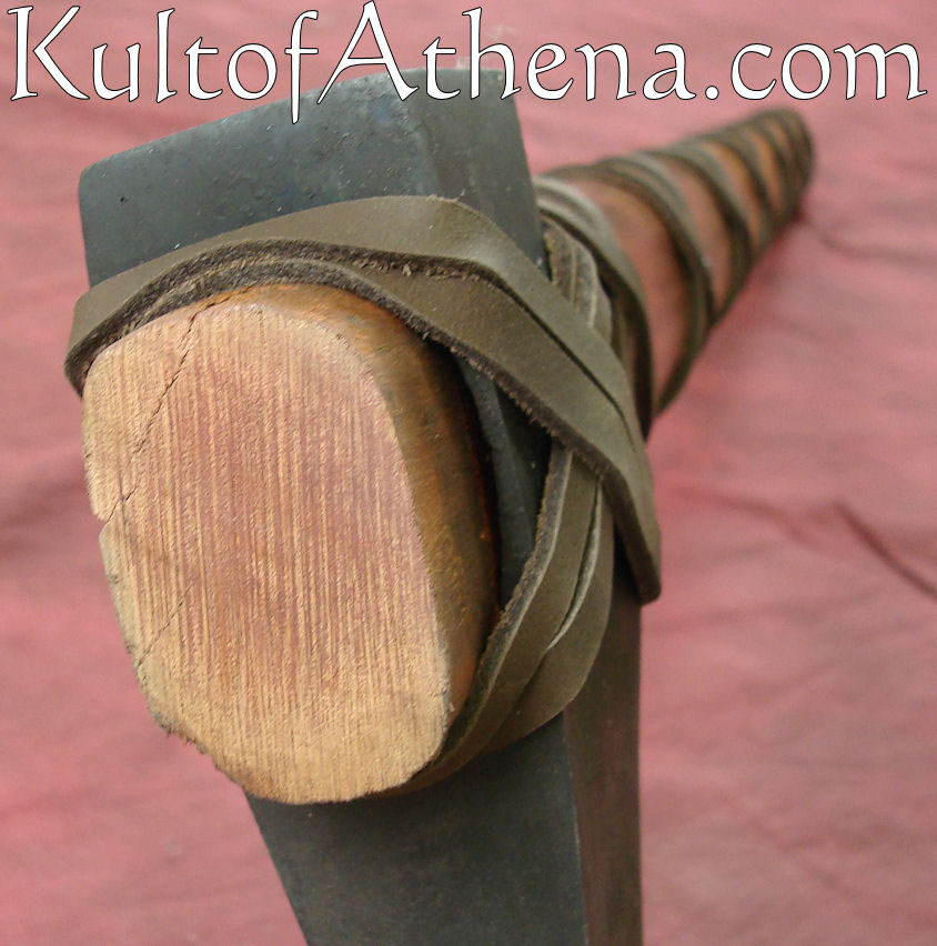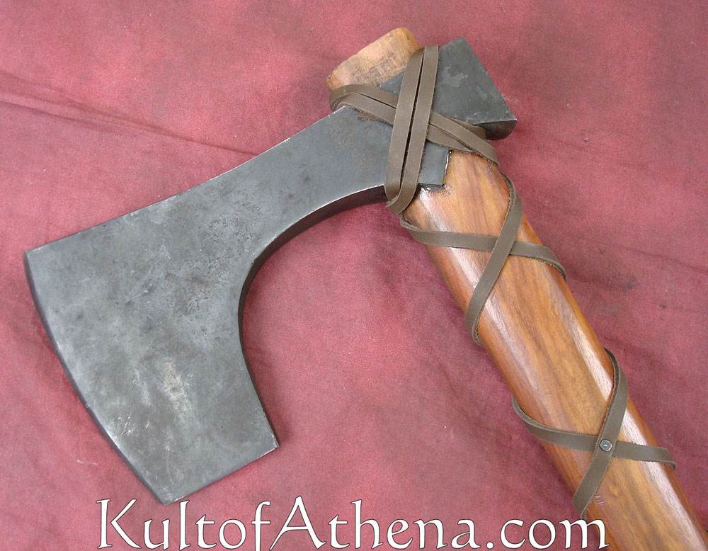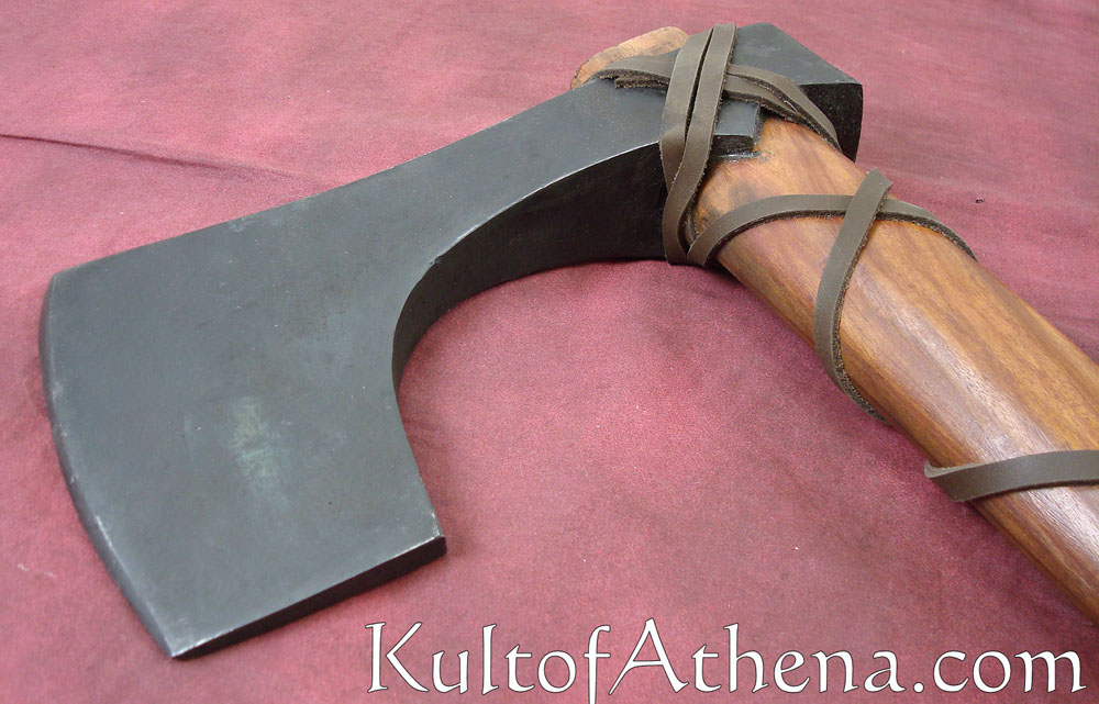 This Viking Axe has a thick, heavy steel head that has been blackened. The haft is of wood and the head is held in place by spiralled leather affixing the head to shaft. The leather has been pinned to the wood in several places. Glue has also been used to bond the head to the haft. Though the handle is short, the axe head is heavy, making this axe large and weighty for its type.