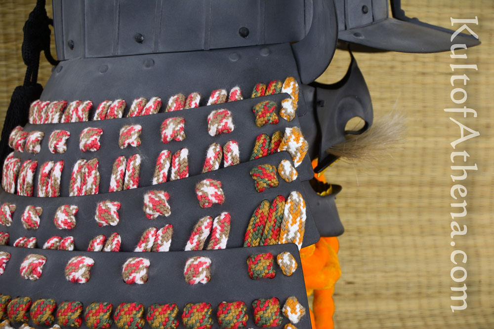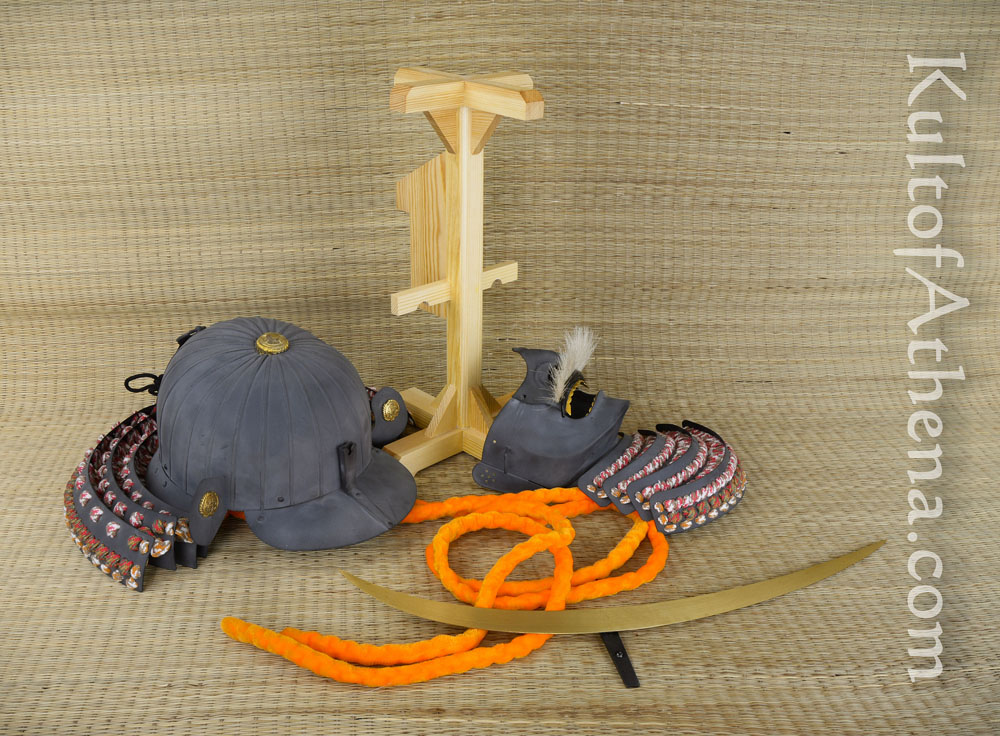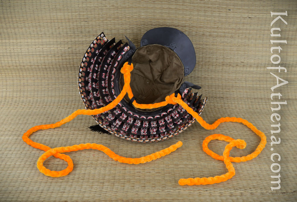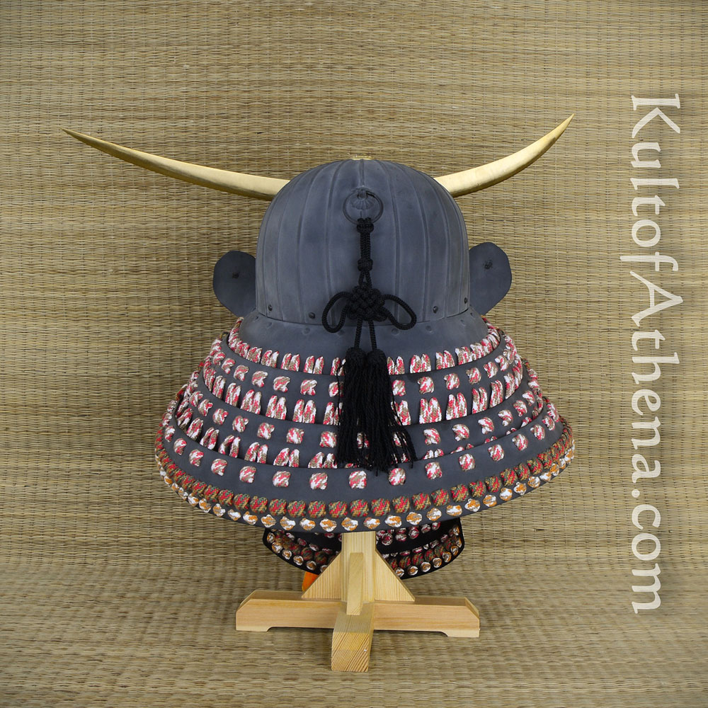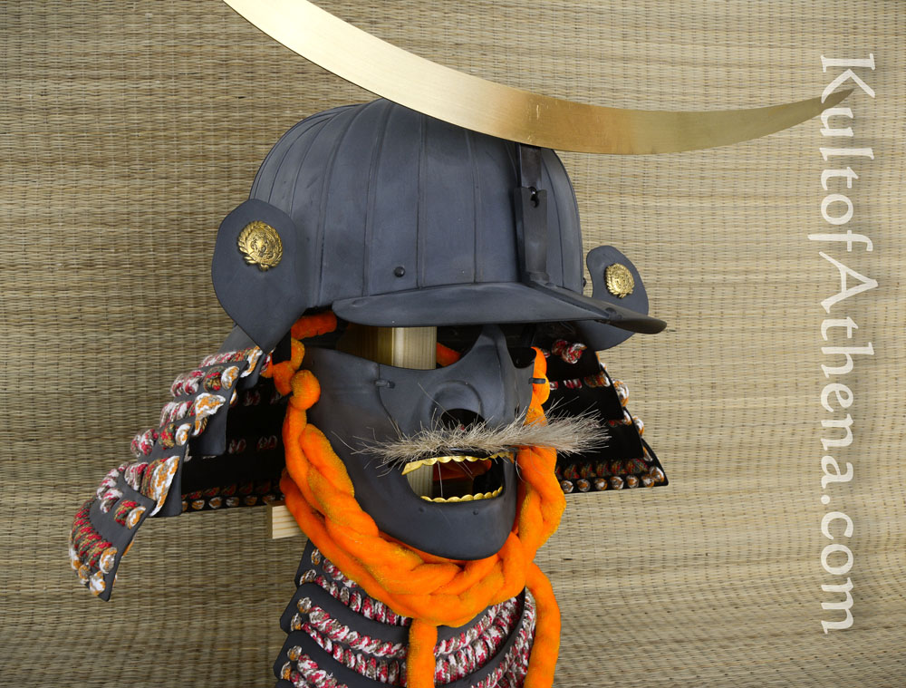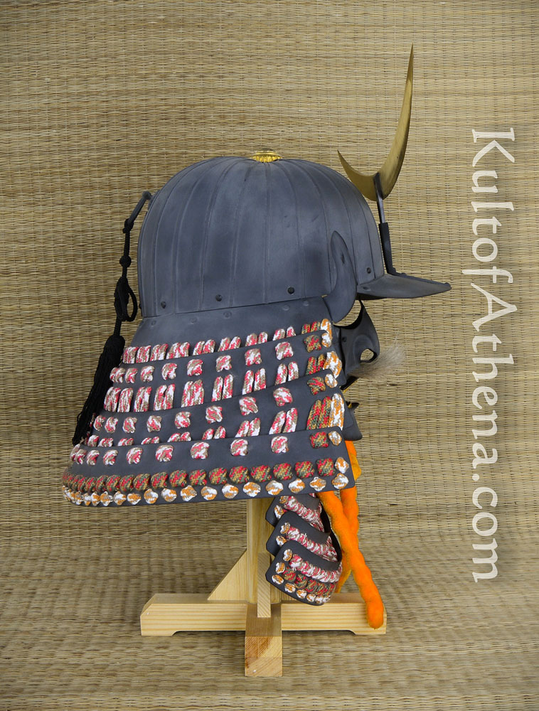 This replica of the helmet of famed Daimyo Date Masamune is lavishly detailed and is not only a great centerpiece to a collection – but fully wearable as well! It is crafted from 18 gauge steel with an antiqued charcoal gray finish. The armor plates are articulated in the traditional fashion with thick cotton cords and the helmet is embellished with brass accents.