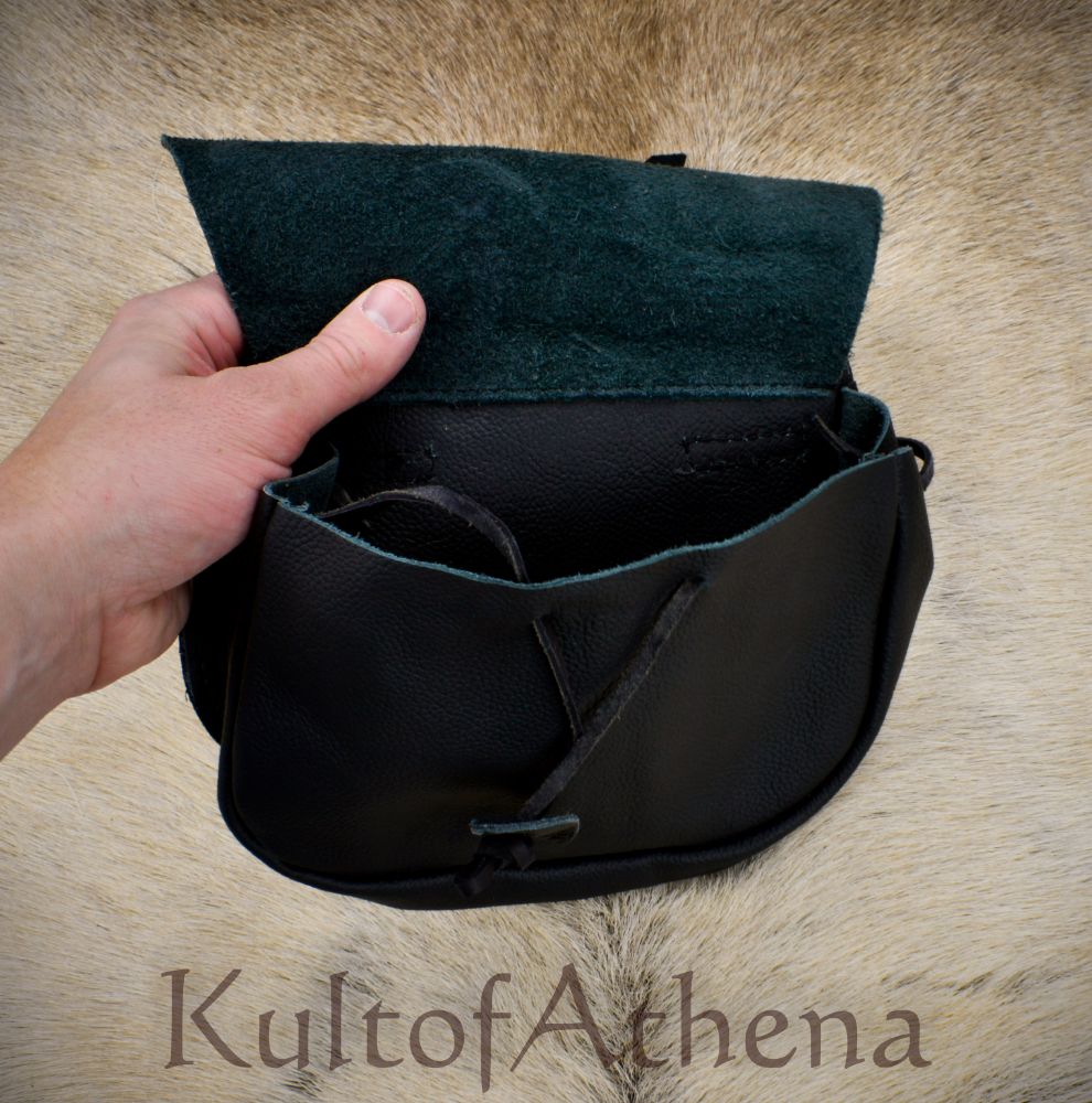 This leather belt pouch is ready to slide onto your belt and carry your coinage, effects and valuables in a fashion that melds perfectly with your kit or costume. It is crafted from genuine leather and is completed with a pair of belt loops and a brass-buckled leather strap. Internal lacing adjusts the fit of the pouch around your valuables and can be cinched for a more secure fit.