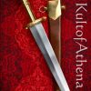 Unsure if Deepeeka is the new Windlass, or what the story is there, but this is nearly that same dagger. It has a solid brass hilt with integral fish-tail pommel. The hilt is small, cramping my large hand when I grip it. As we don’t fight with our daggers in our Battle Pageants, it’s not coming out of it’s sheath often, so that’s NOT the deal-killer a too-small hilt normally would be. The guard appears a separate piece, and is a classic Katzbalger styled “S” guard with ball finials at the terminals. The blade, ordered unsharpened, has a perfect “fighting” edge to it, but the tip is wickedly pointed so that would need to be rounded for stage combat use IF that was it’s intended use.