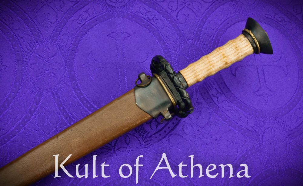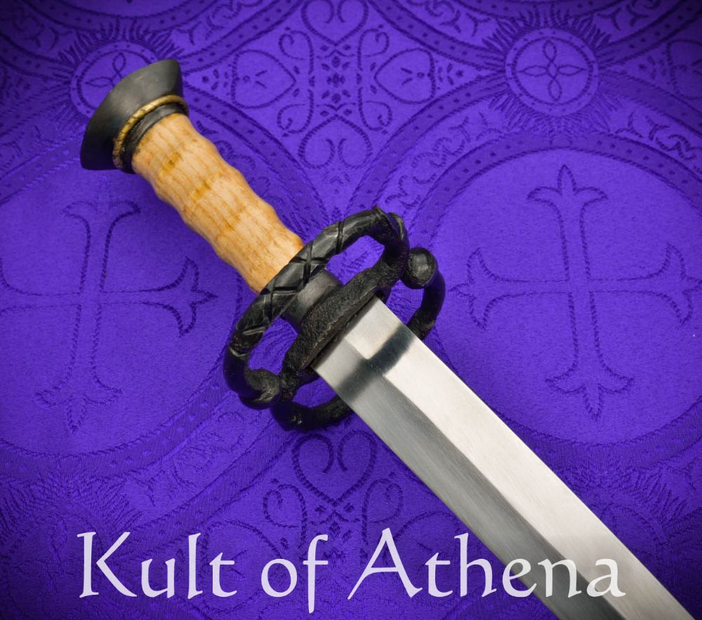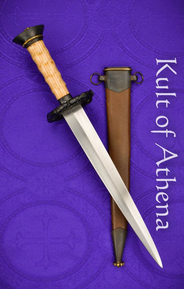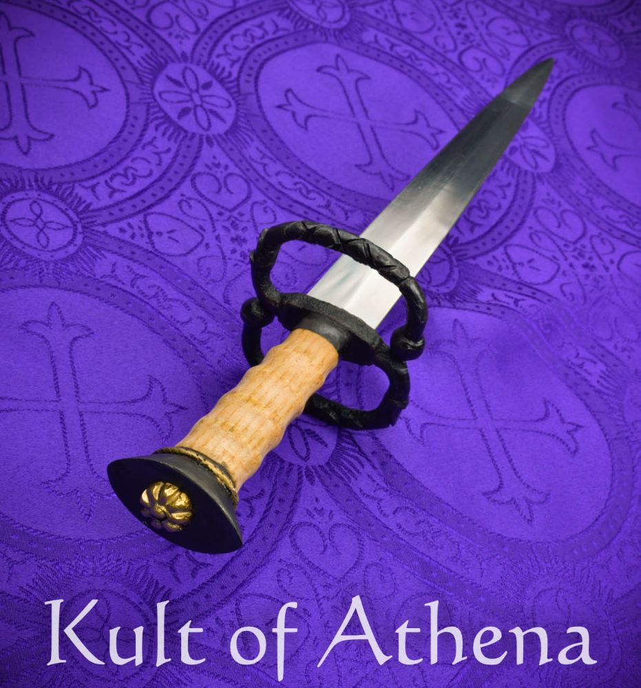 This Landknecht Dagger is based on a historical example from Solingen, Germany and makes a fine companion piece to a Katzbalger sword and functions eminently well as the finishing piece to a Landsknecht ensemble. The stiff and thin blade will ably pierce thick clothing or the gaps in an armored defense in a melee scrum and the wide S-guard gives much more protection for the hand than most daggers. The blade is crafted from tempered high carbon steel and the guard and pommel are crafted from blackened steel. The grip is well-carved wood and brass accenting completes the dagger. The dagger is matched with a scabbard of thick leather and is completed with blued steel fittings and brass finishing accenting. Brass hanging rings allow for it to be worn.