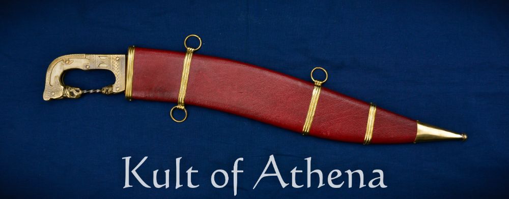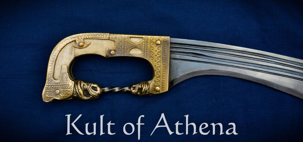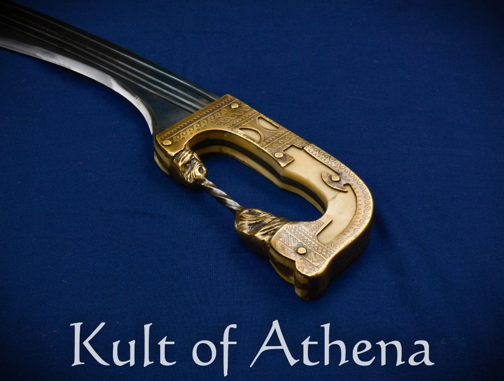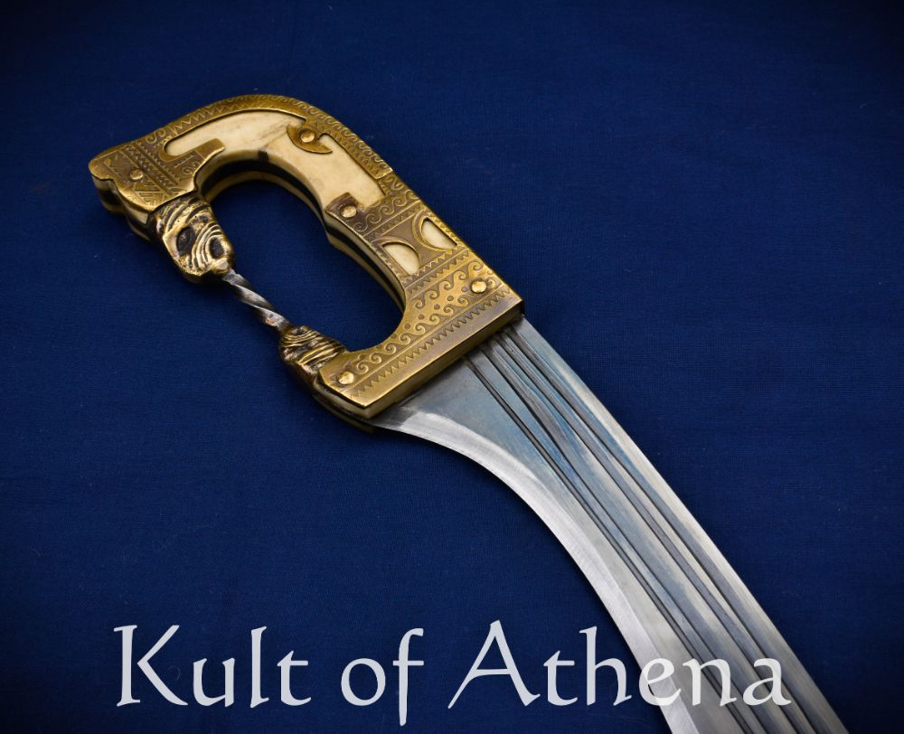 This Falcata from Deepeeka is closely based on a historic Iberian original that is kept within the collection of the National Archeological Museum of Madrid in Spain. This reproduction of a particularly elaborate and embellished Falcata has a blued blade of tempered C60 high carbon steel (a steel with properties very similar to 1060 high carbon steel) – its forward swept recurve blade was purpose designed for powerful, helmet splitting chops and fearsome hacks and cuts. The blade is mounted into the hilt with a full tang construction that has two grip scales of polished bone which are riveted directly to the thick blade tang. The hilt is finished with highly detailed plates and a knuckle bar of antiqued brass.