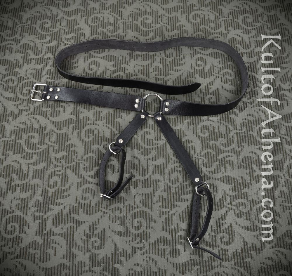 This medieval sword belt is crafted from sturdy black leather and brass rivets with an adjustable antique-finished metal buckle.  It has an integrated metal ring that supports two adjustable, buckled leather straps that can be wrapped around a sword scabbard. The hanging straps can be used to go around scabbard rings as photographed below, or they can be directly wrapped around a scabbard.