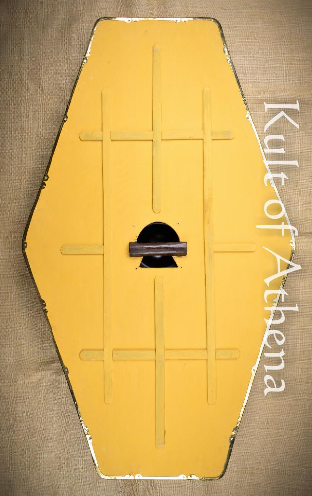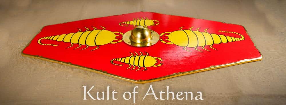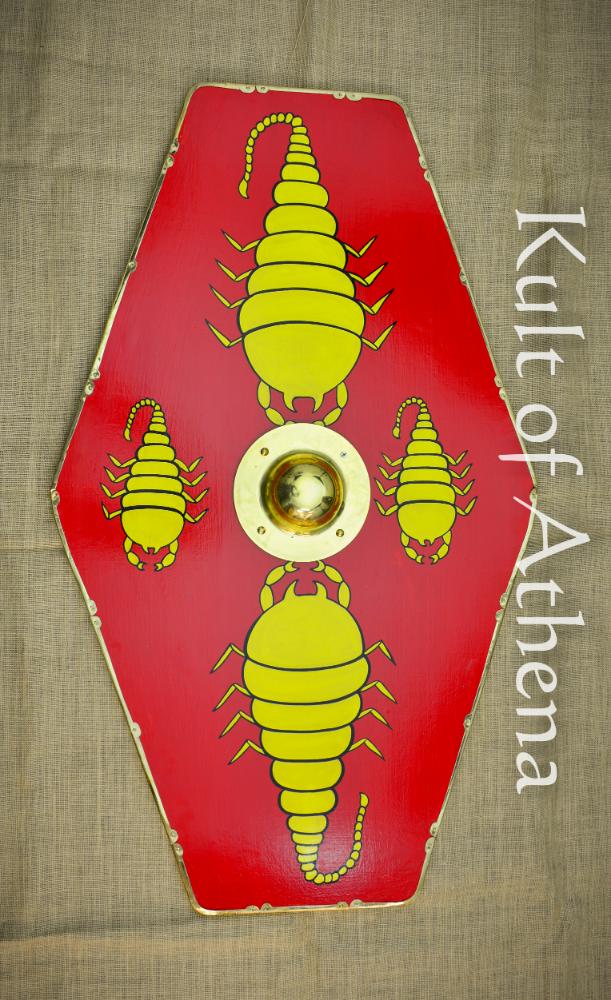 This bold shield with its Scorpion design marks its bearer out as one among the famed Praetorian Guard of Rome. Crafted from thick poplar and tightly bound in linen, it is built in the traditional manner for strength and resilience. Stout reinforcing battens brace the reverse, while a secure central grip ensures confident handling in formation or on the march. The face is hand-painted to a high standard, displaying its commanding insignia band the perimeter is finished with brass edging. A polished brass boss completes the shield and gives it the authoritative presence befitting the powerful and influential members of the Praetorian Guard.