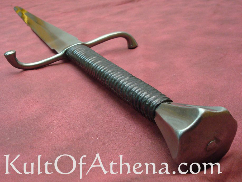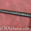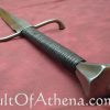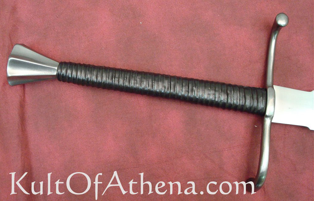 The Del Tin Swedish Two Handed Sword is based on a design from the beginning of the 16th century and features a long diamond cross section blade that narrows towards the hilt. The steel guard is ”S” shaped and the pommel is a faceted scent bottle Design. The long grip is made of wood with a ribbed leather covering. The unsharpened blade is made of well tempered Chrome-Vanadium steel with a hardness of 50HRC and is peened to the pommel for durability.
