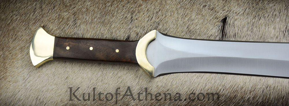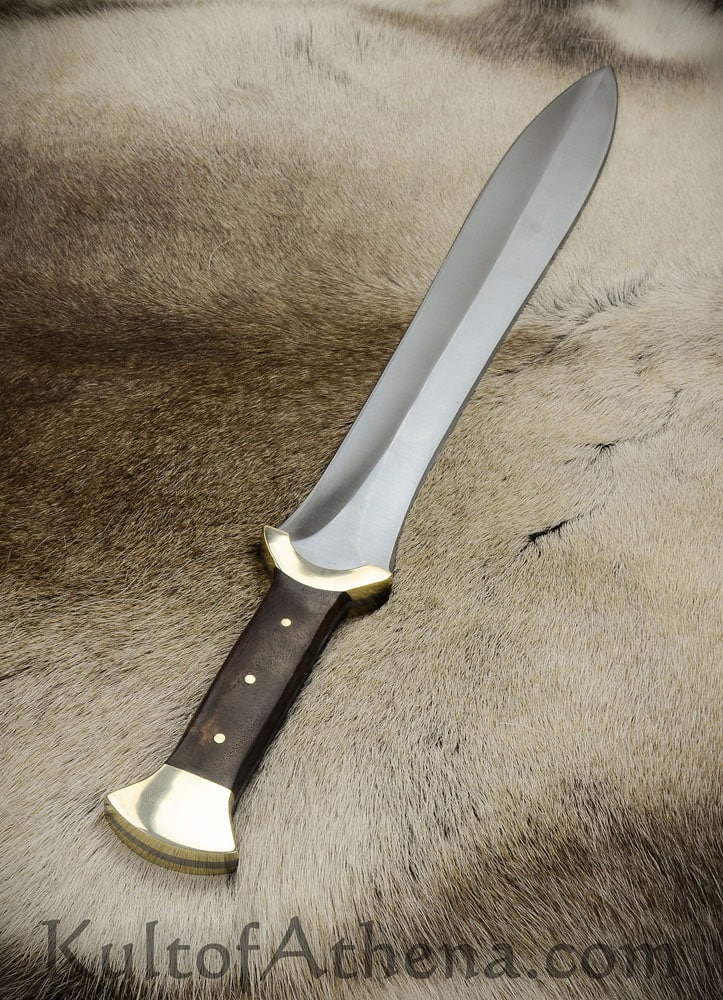 This sword is an excellent choice for those who wish to experience the strong cutting and cleaving power of ancient leaf-blade swords in a durable and practical design which comes pre-sharpened and ready for use. Swords such as this could compensate for their moderate length by maximizing the cutting power of the blade itself with a design that could strike with substantially greater force than a blade with a narrower profile. It is an overall efficient and practical design perfectly suited to the needs of warriors and the materials technology of antiquity. It is now reproduced here in pure modern steel coupled with one of the most durable hilt construction types possible.