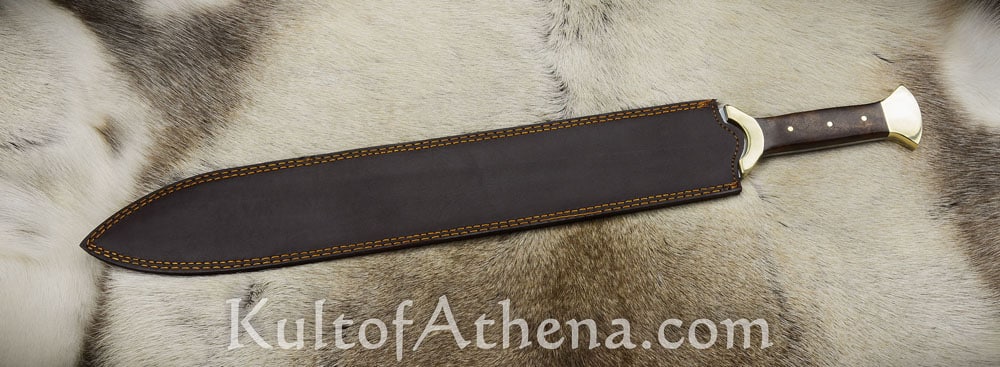 The sharp blade is crafted from high carbon  steel and the blade has a thick, full tang which is clearly visible within the composite grip to ensure that there can be doubt as to the solid construction of this hilt design. The guard and pommel are fashioned from brass and the grip is completed with polished halves of wood which have been triple-riveted into the tang with brass. Included with the sword is a durable leather sheath with stitched construction.
