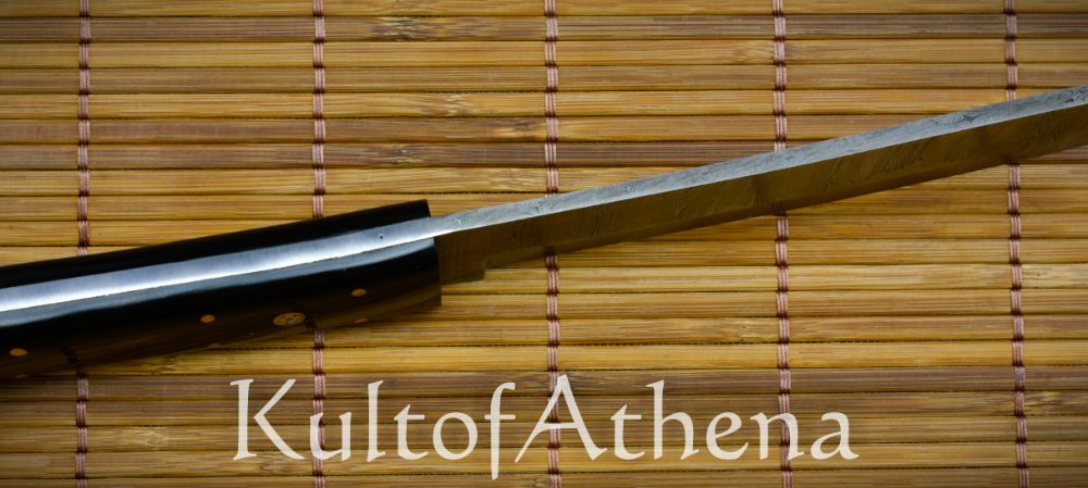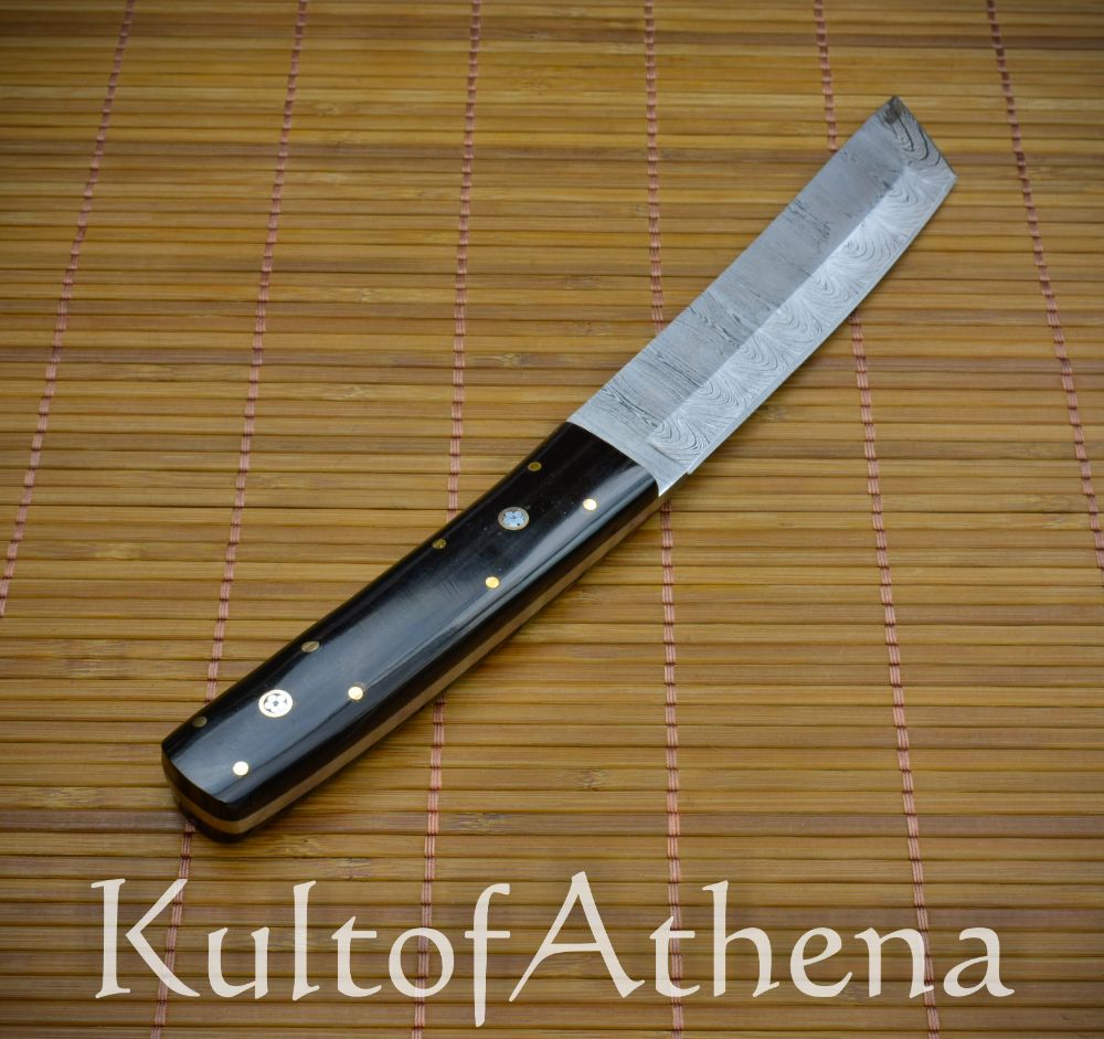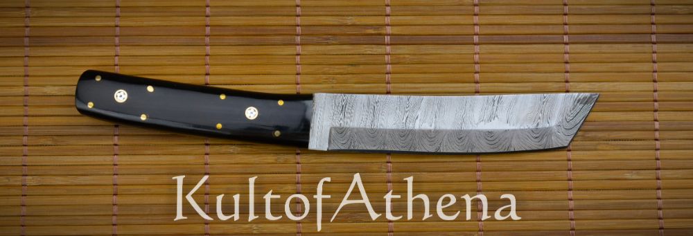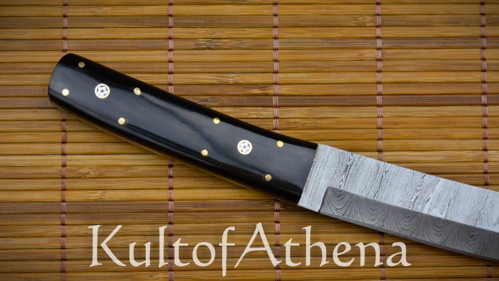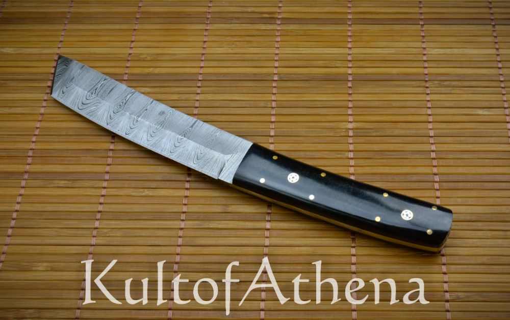 The Devil’s Ede Tanto Dagger combines the sweeping elegance of the Japanese Tanto dagger with hand-forged and folded Damascus steel and an intricately detailed grip. The blade is forged from folded Damascus steel and its vibrant ripple-like patterning throughout is a testament to the skill of the bladesmith when two different steels were folded and melded into one another to forge a single blade. The dagger is as constructed as robustly as possible with a thick, full tang and its grip is formed from two halves of buffalo horn which are polished smooth to an elegant sheen. The scales are durably brass-pinned to the tang and the dagger is completed with intricate inlaid brass-encircled chrysanthemums on both sides of the grip.