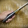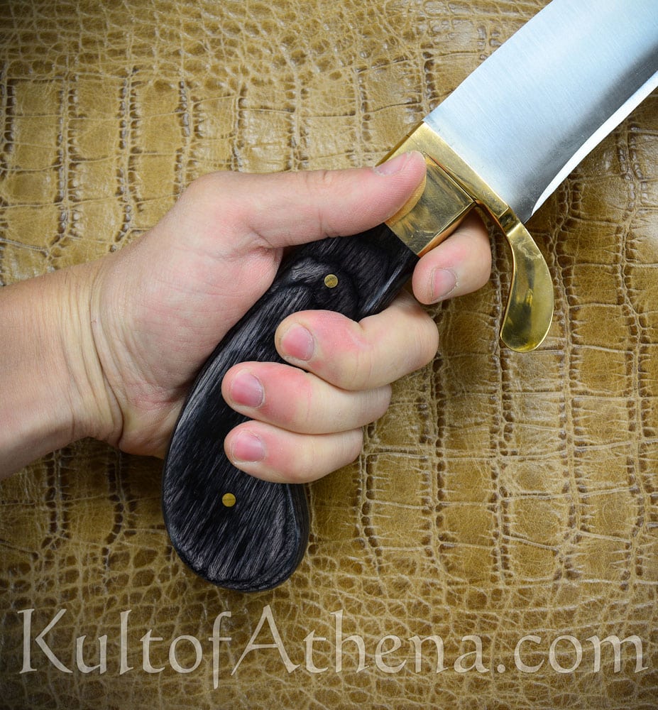 This Kopis is robustly constructed Kopis and a good pick for those who want to experience the great chopping power of these ancient Greek swords at a practical price. The thick blade spine and forward-sloping, elongated tip of the of the Kopis combine to give it a chopping and hacking power more akin to an axe than a sword! Its thrusting potential can also be surprising and a good warrior could use that to his advantage as his foe may look at his sword and expect a slash or a cut instead of the thrust.