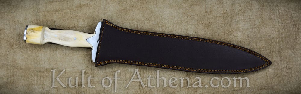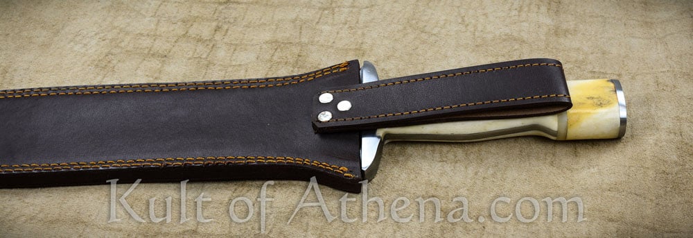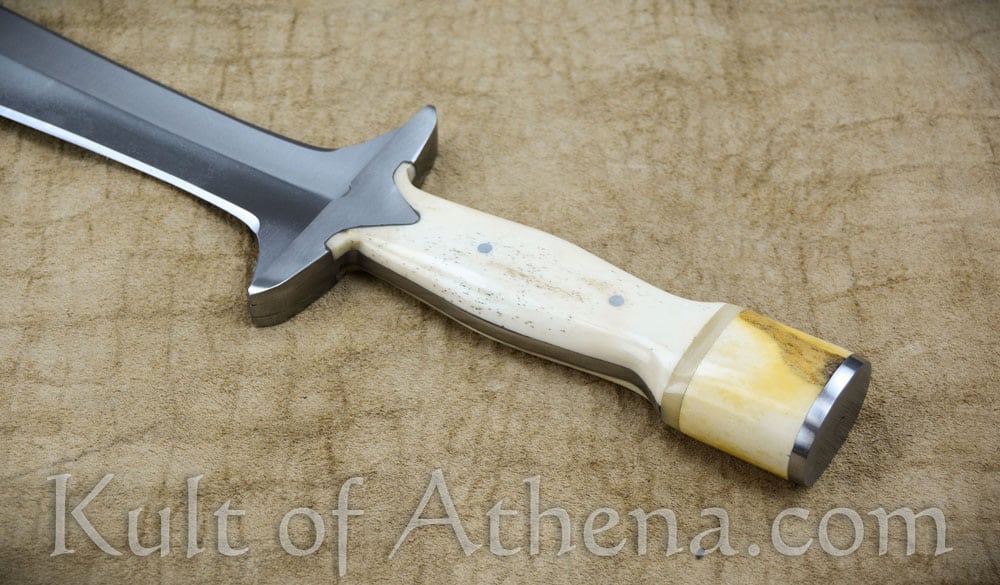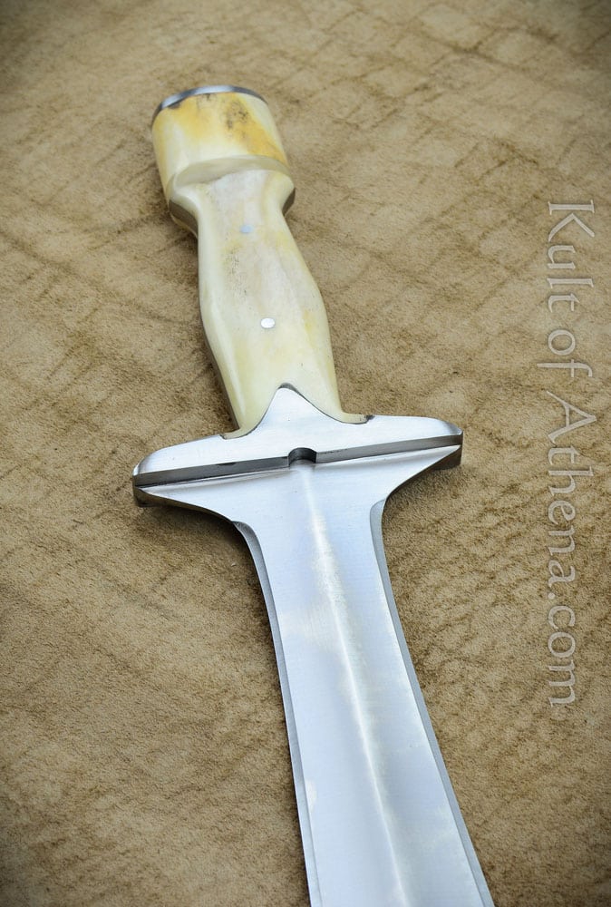 This short Xiphos is fitted with a sharpened blade of high carbon steel; the grip of polished bone is pinned to the thick blade tang to create the grip. The pommel is likewise of bone and is finished with a pommel disc cap of steel. The sword is accompanied with a scabbard of leather.