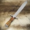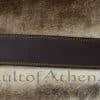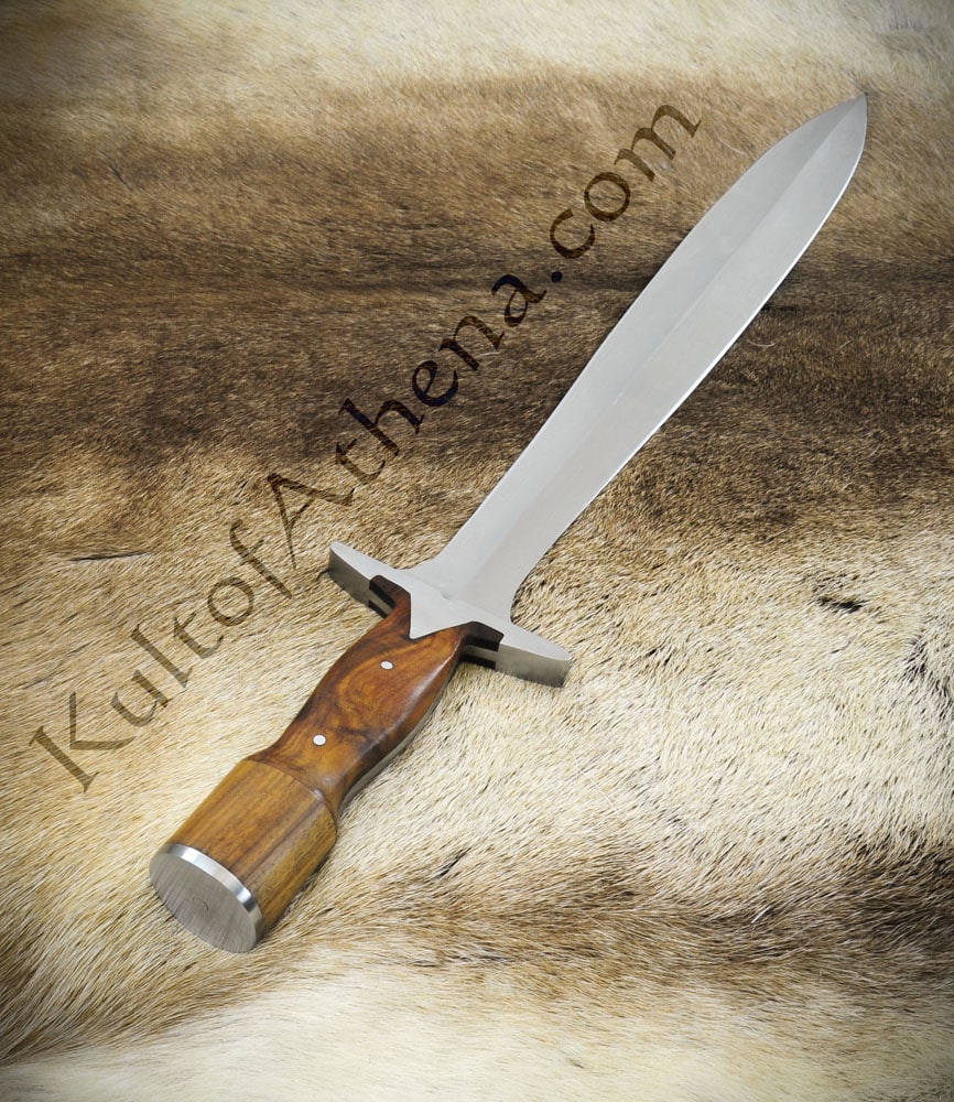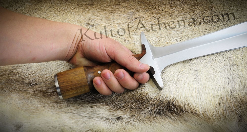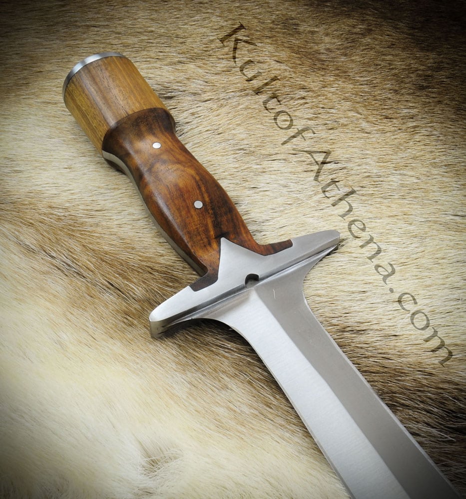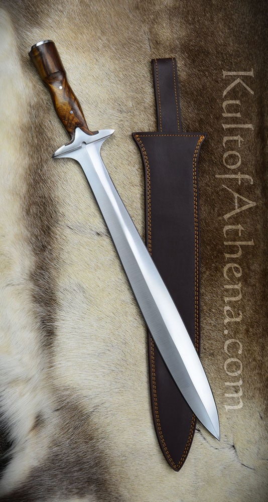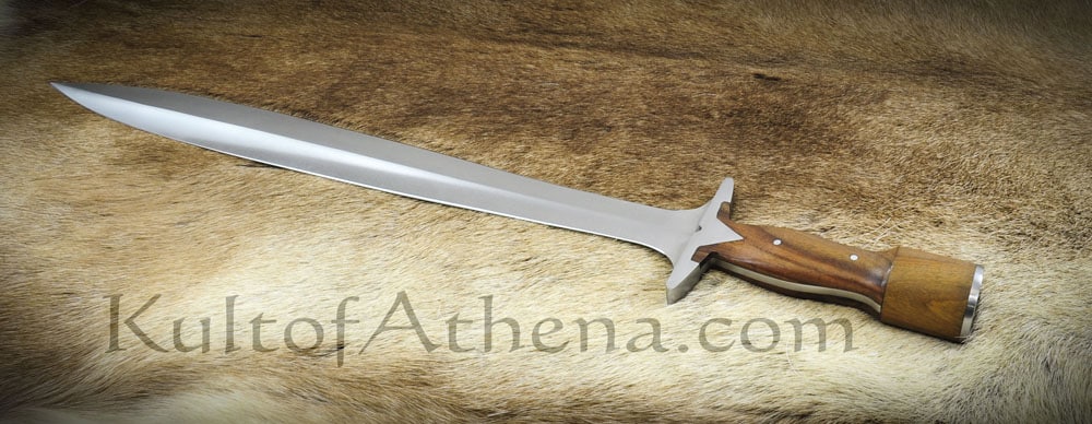 This Greek Xiphos possesses a tempered and sharpened blade of high carbon steel. The grip of carved and polished hardwood is dual-pinned to the thick blade tang. The pommel is also wood and is capped on its end with a steel disc. The sword comes with a stitched leather scabbard with an integrated riveted belt loop.