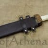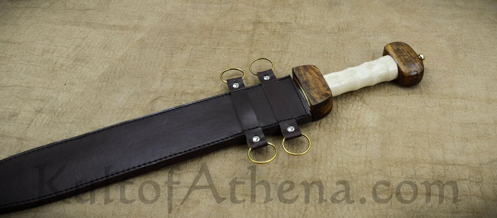 The scabbard is crafted from stitched leather in a dark brown color. The brass hanging rings are fitted to leather bands that are fixed into position with stitches to complete the scabbard.
