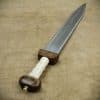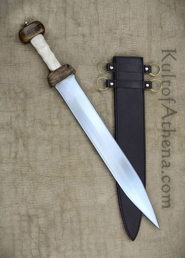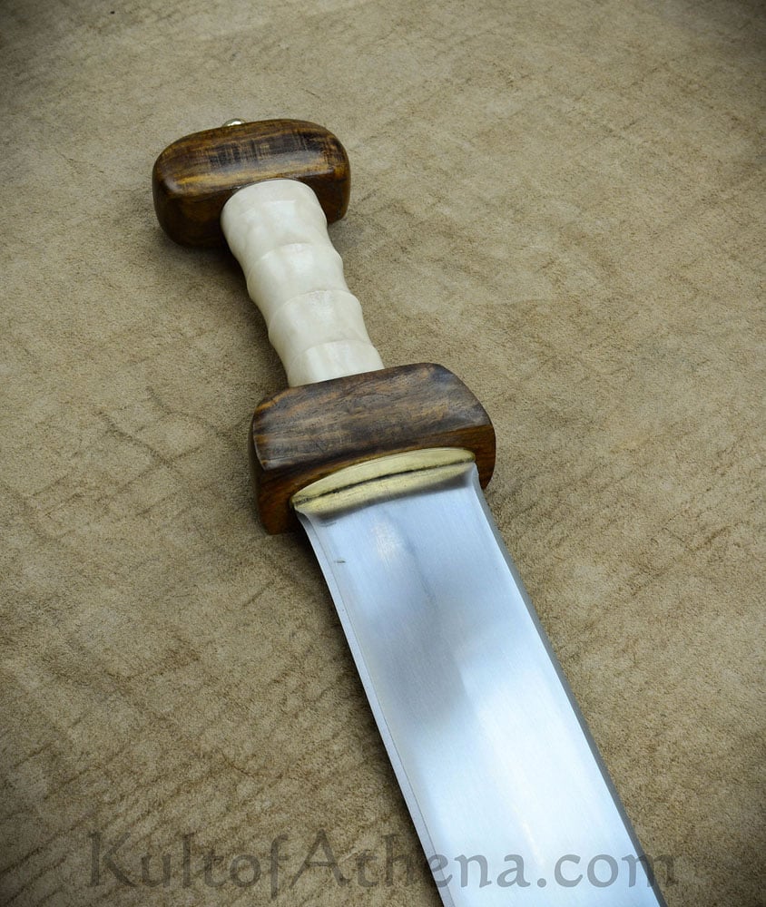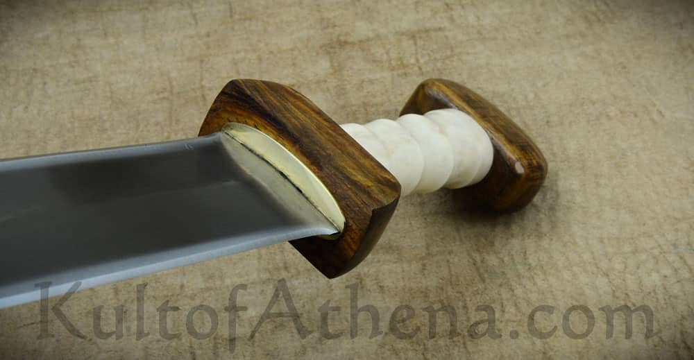 Named for the Murmillo Gladiator who was equipped with the Gladius and Scutum shield in similar fashion to a Roman Legionary, this blade is brutal in its simplicity. It features a sharpened blade of hand forged and tempered high carbon steel with an acutely pointed tip. The blade is in the Roman Fulham style with straight edges and an elongated thrusting tip, well suited to the arena. The guard and pommel are carved from wood and the grip is polished bone. The oval guard plate and pommel nut are crafted from brass.