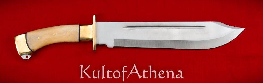 Tough, dependable and a vicious combatant, the Outlander Bowie is a large fighting knife ready to chop, cut, sever and puncture its way through any scrum. The blade has a thick spine for durability which also adds the mass needed to power it through decisive chops and the clipped-point tip is well-reinforced for powerful puncturing. The blade is tempered 1070 high carbon steel which is a fine balance between steel hardenability and resilience. The guard is solid brass and the grip features full-tang construction for the most robust construction possible. The composite grip is scales of brass and smooth-polished bone intersected with bold red Pakkawood. The elongated pommel greatly aids in keeping the Bowie in hand and a pre-drilled lanyard hole at the end of the blade tang complete the knife.
