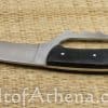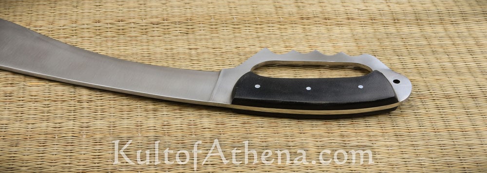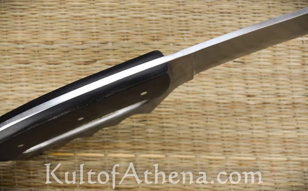 The hilt of the sword is made with as durable a construction as is possible; both sword blade and extra-thick tang are a single-piece construction and the grip is completed with tough scales of micarta which are anchored into position with steel rivets. Included with this sword is a sheath of durable leather with a buttoned retaining strap and an integrated belt loop on its reverse.
