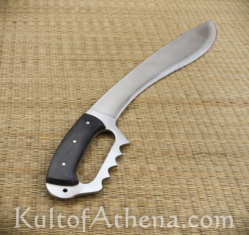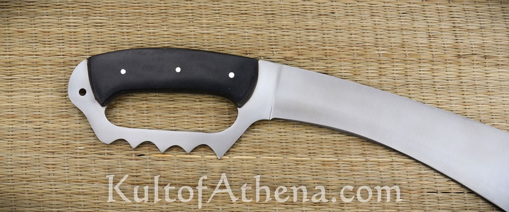 Viciousness melded wholly with ruthless pragmatism, this fierce chopper of a sword is ready for the scrapyard fighting pits and velocity-fueled Outrider battles of the wasteland of Apocalypse. Robustly constructed and hard-hitting, the Devils Edge Wasteland Chopper is built for survival; the thick-spined blade is sharpened high carbon steel with a durable convex grind. The large Khukuri-like blade hits with hatchet-like cleaving and hacking power which deeply bites into the target with the powered force of the strike and then separates it cleanly with an elongated, wedge-like cutting plane. Rampaging mutants and gore-maddened zombies would find themselves literally cut down to size in short order against such a blade. For truly close-in scraps the spiked knuckle bar doubles as a jaw-crunching knuckleduster.