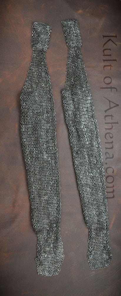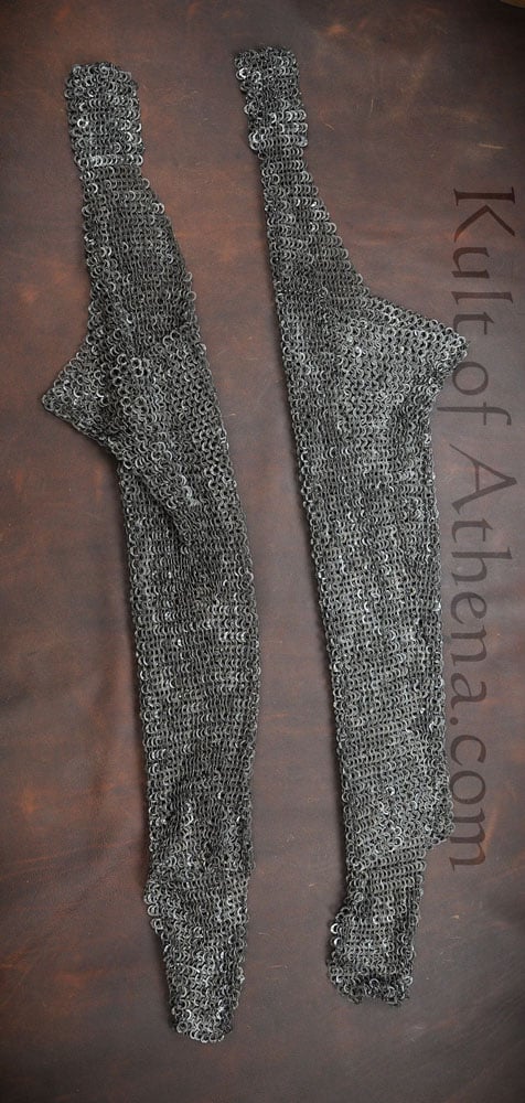 These mail leggings (chausses) are crafted from flat rings of stainless steel that have been dome riveted and then darkened for a finish.