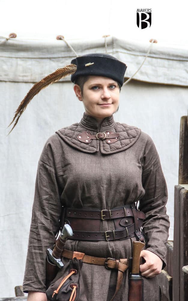 This padded collar is a great foundation layer beneath your armor and helps distribute and cushion against both the weight of your armor and the force of a strike from a foe. It is crafted from durable cotton cloth and padding. A metal buckle anchored with leather tabs and rivets fastens and secures the collar. Made from 100% cotton – From Burgschneider of Germany.