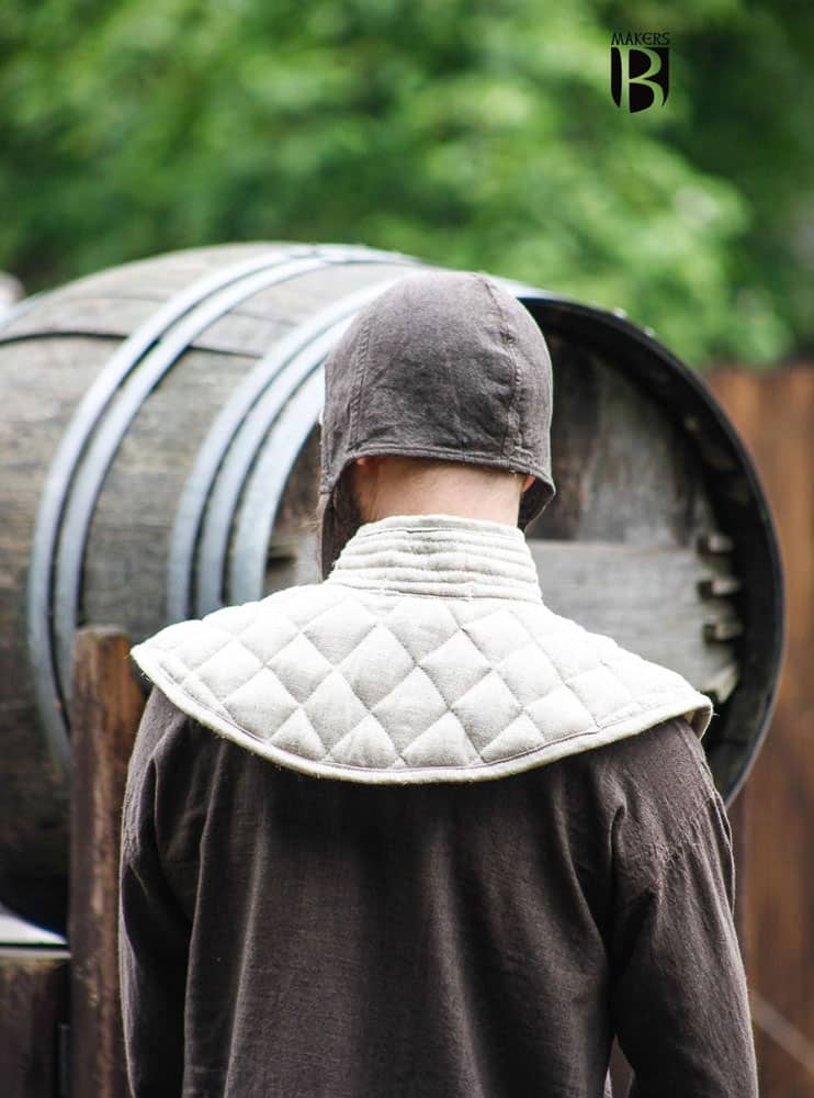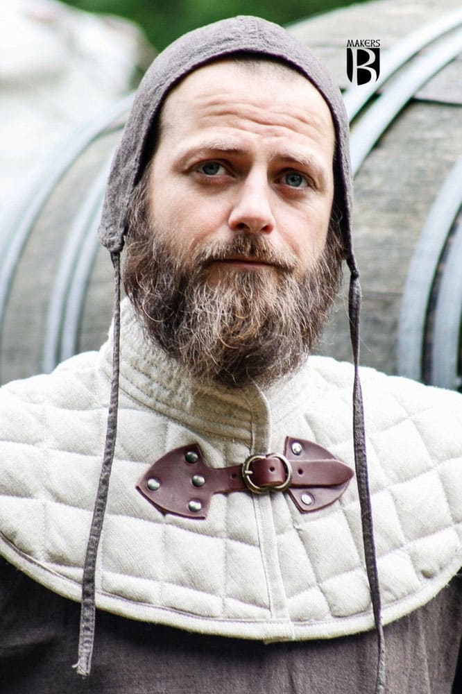 This padded collar is a great foundation layer beneath your armor and helps distribute and cushion against both the weight of your armor and the force of a strike from a foe. It is crafted from durable cotton cloth and padding. A metal buckle anchored with leather tabs and rivets fastens and secures the collar. Made from 100% cotton – From Burgschneider of Germany.