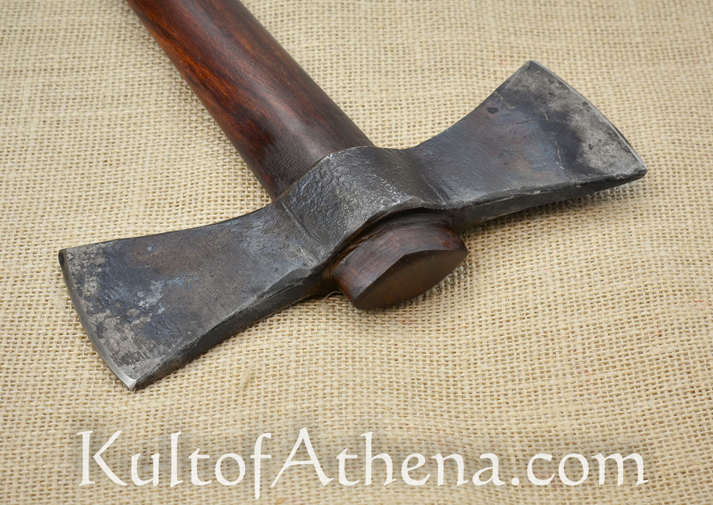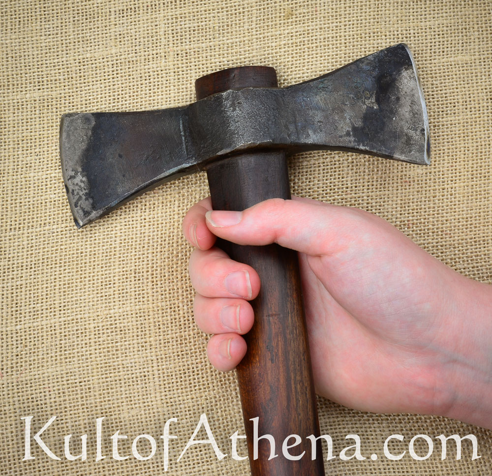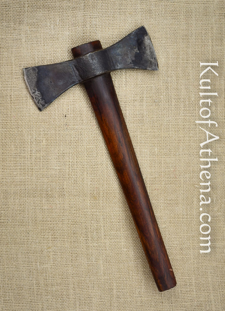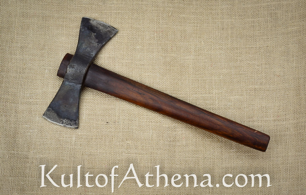 This small, unsharpened double-headed tomahawk is made from forged carbon steel and is mounted onto a wooden shaft.